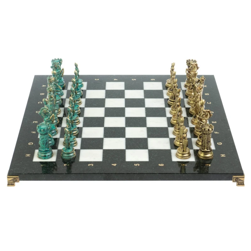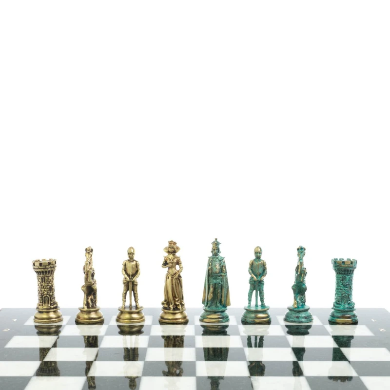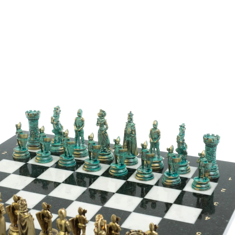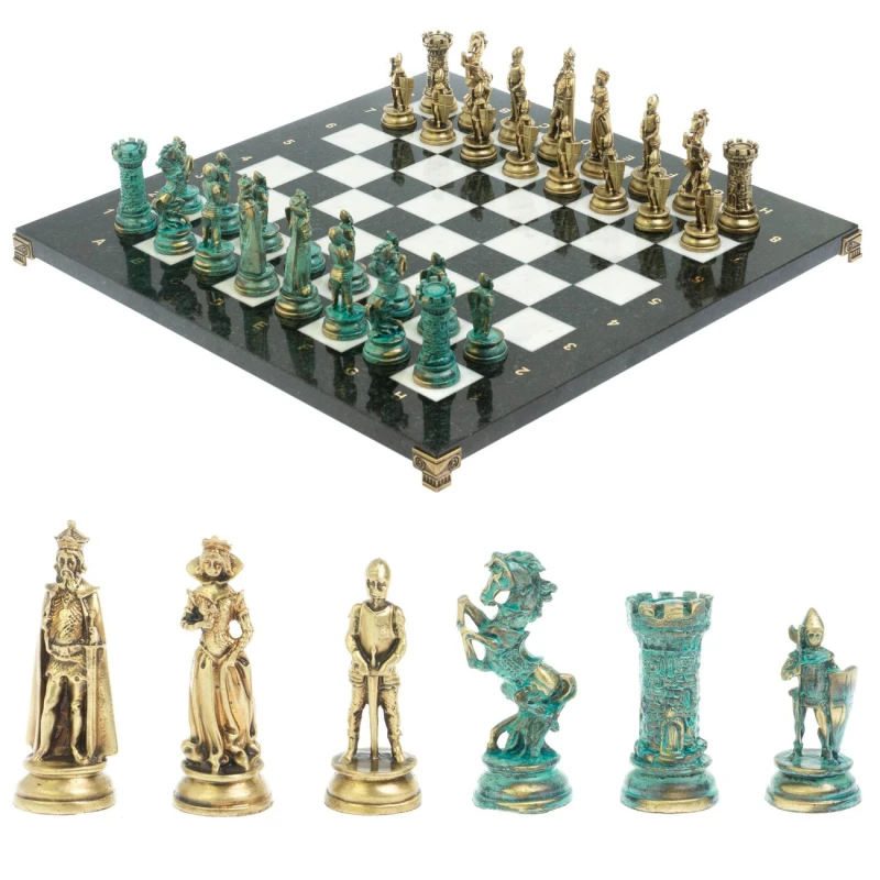 Набор для игры в шахматы "Средневековые рыцари" изготовлен вручную, доска из натурального камня, шахматные фигуры металлические в цвете бронза и патина. Характеристики: • доска 44х44х2,5 см • клетка 4,5х4,5 см • высота фигур: пешка 8 см, король 10 см • упаковка: подарочный кейс из экокожи • вес 14500 г.