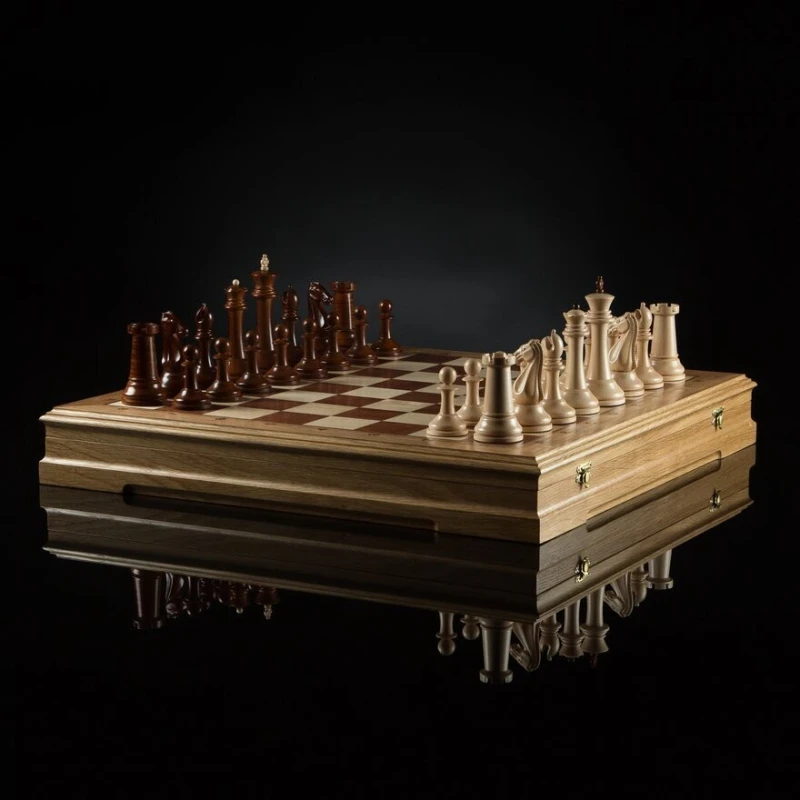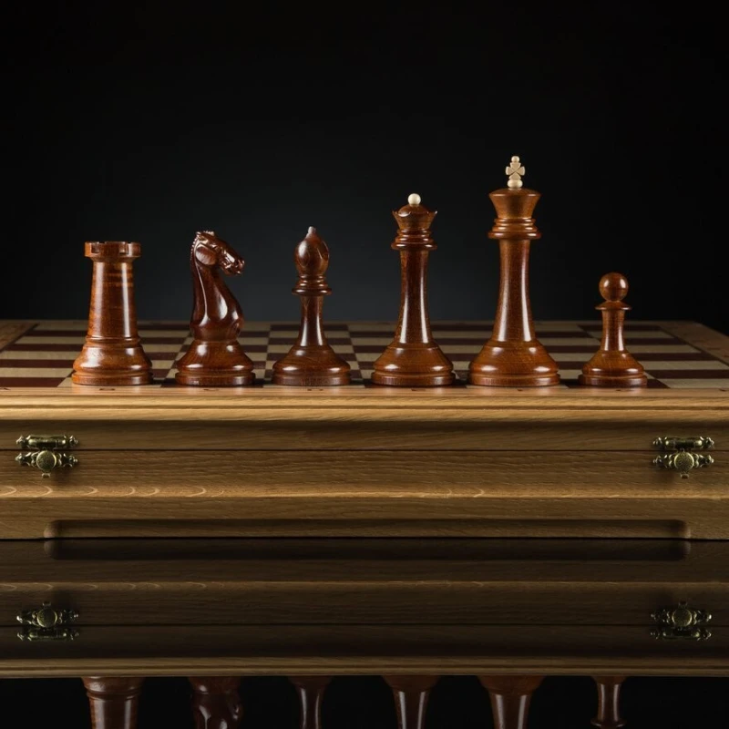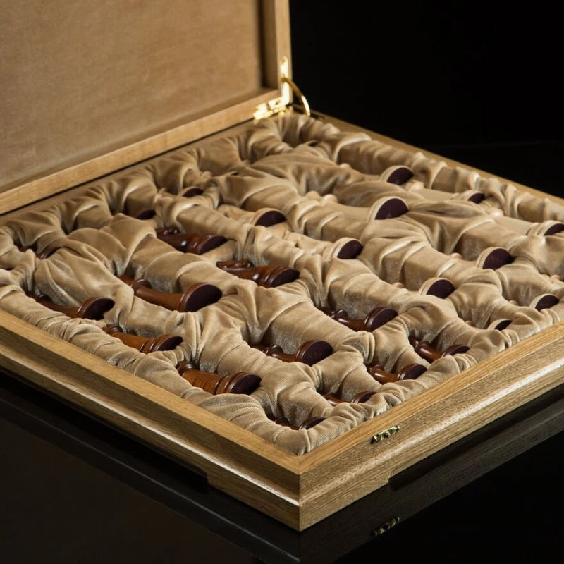 крышка открывается и удерживается в вертикальном положении петлями с ограничителем, внутри мягкий ложемент из бархата, ячейки для каждой фигурки, ножки доски подклеены замшем.