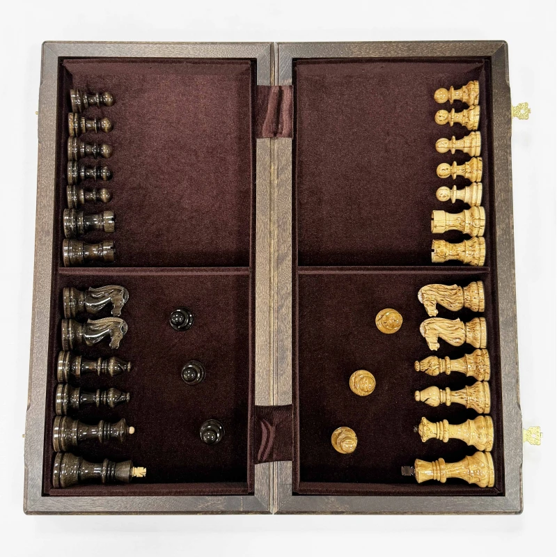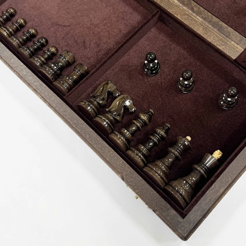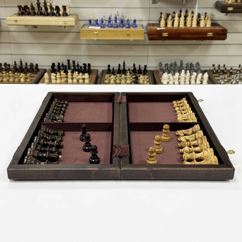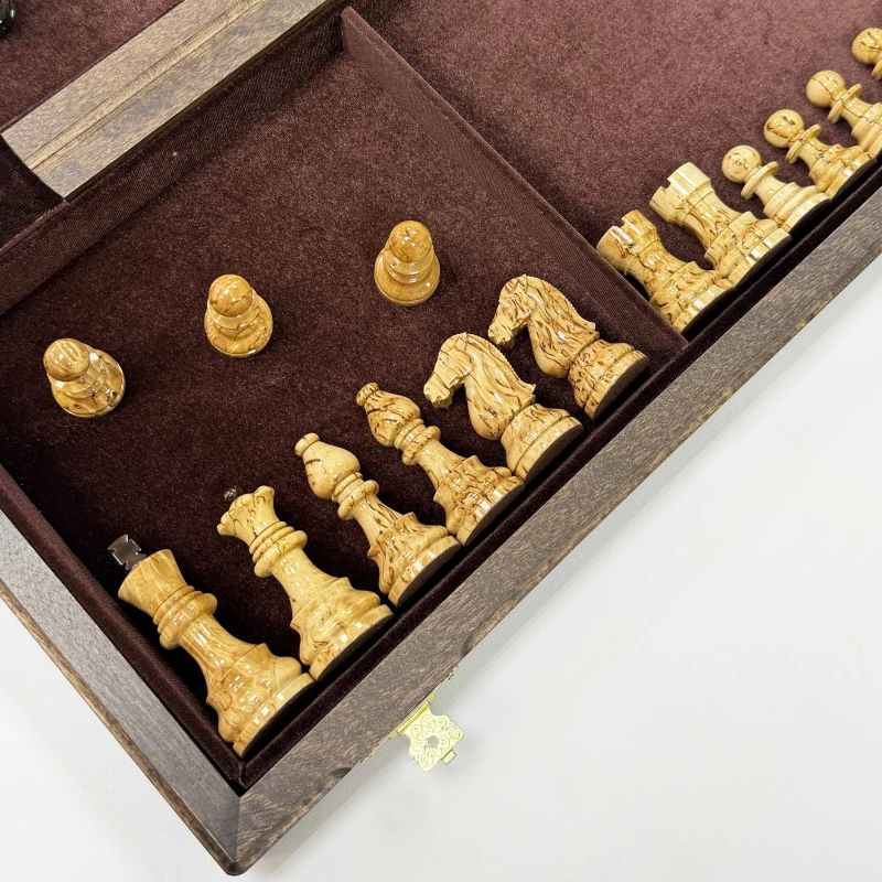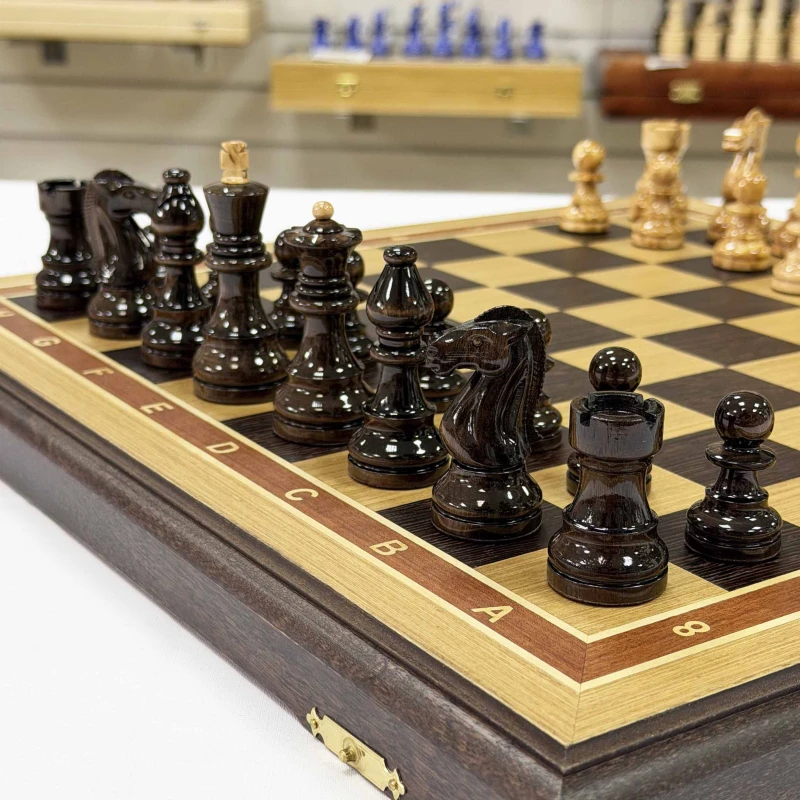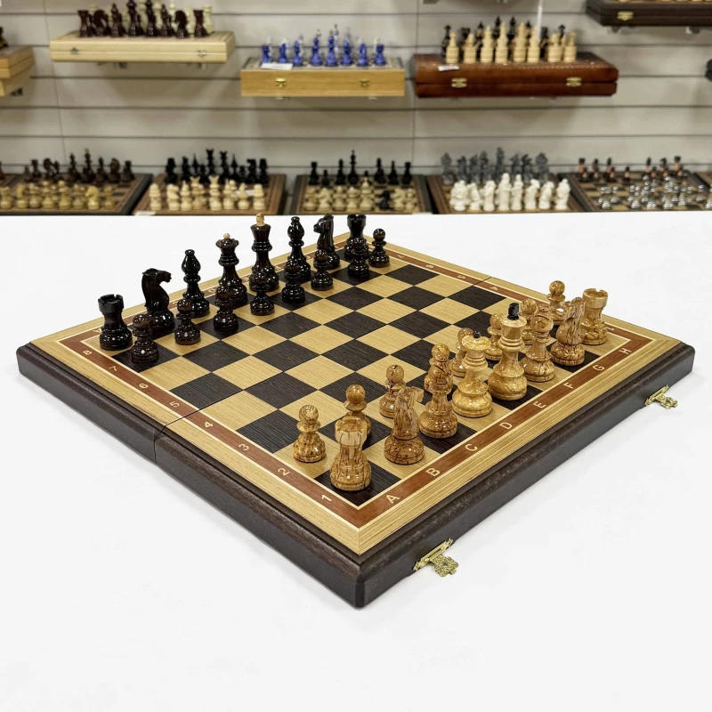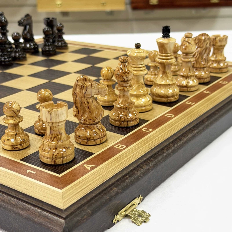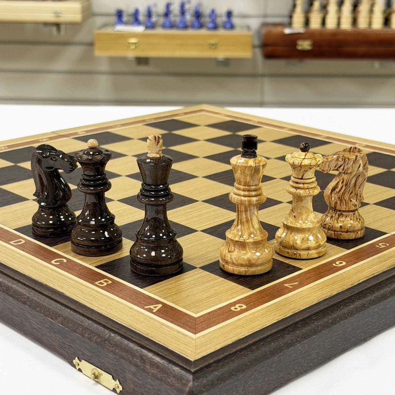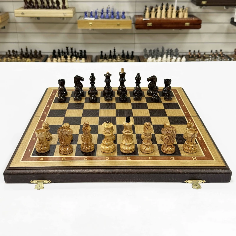 Классические шахматы в стиле Стаунтон на доске из дуба. Эксклюзивный набор шахматы ручной работы из ценных пород дерева. Оптимальный размер доски 45 на 45 см в разложенном виде, в меру утяжеленные фигуры из карельской березы с уникальной структурой дерева. Шахматные фигуры покрыта глянцевым лаком. Внутри доска покрыта бархатом. Закрываются на 2 замочка. Шахматная доска собирается в ручную по технологии маркетри. Подойдут в подарок для взрослых и детей. Купить красивые шахматы ручной работы из дерева или камня можно в наших магазинах в Москве и в Санкт Петербурге, либо заказать доставку по всей России.