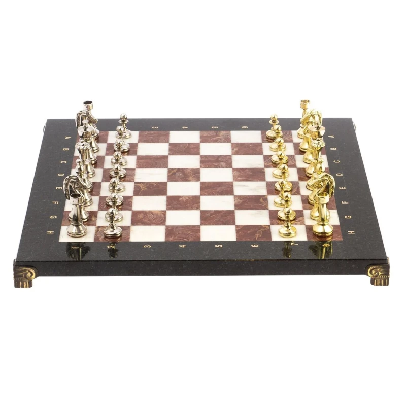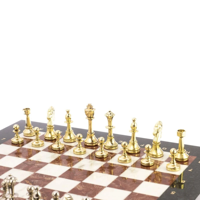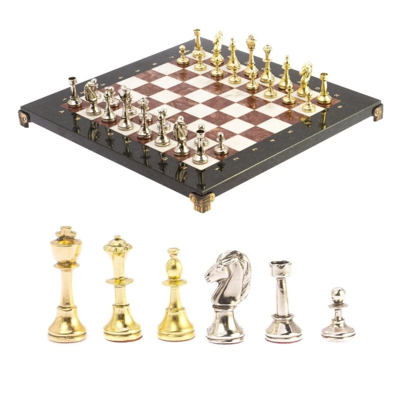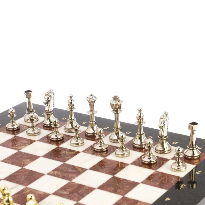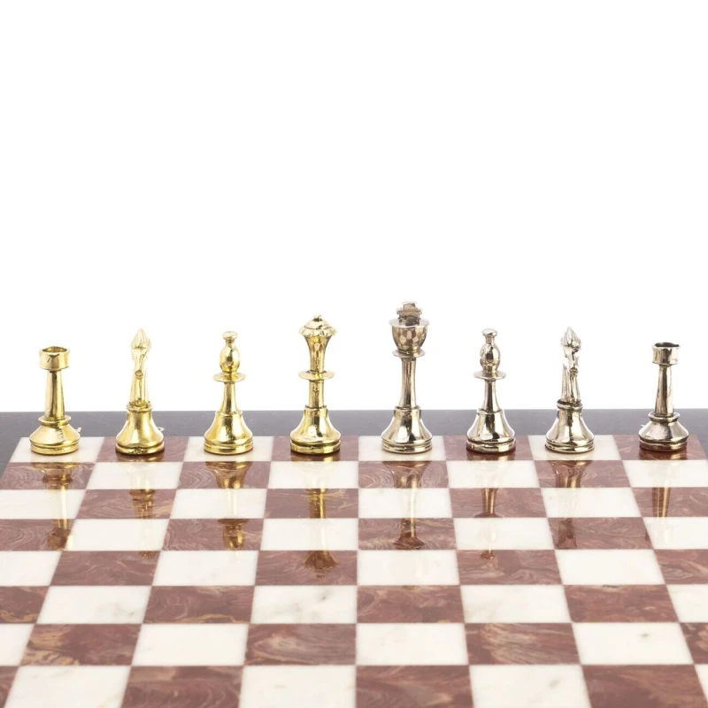 Каменные шахматы из мрамора, змеевика и лемезита с металлическими фигурами Стаунтон. Размер доски 36 на 36 см, клетка 3 см. Фигуры с утяжелением и подклейкой. Вес набора 7 кг.