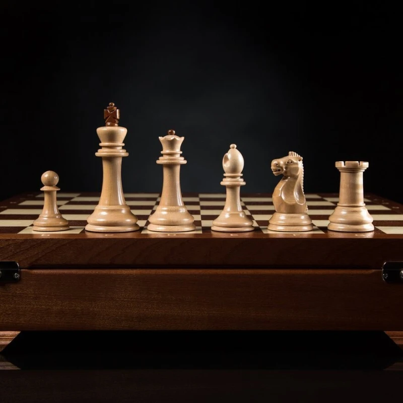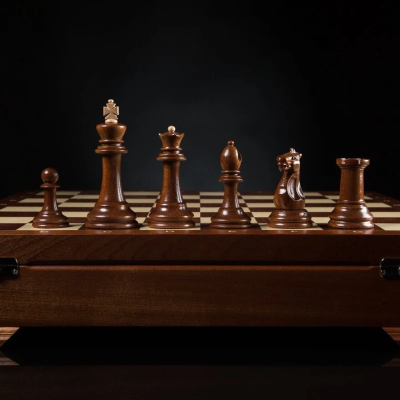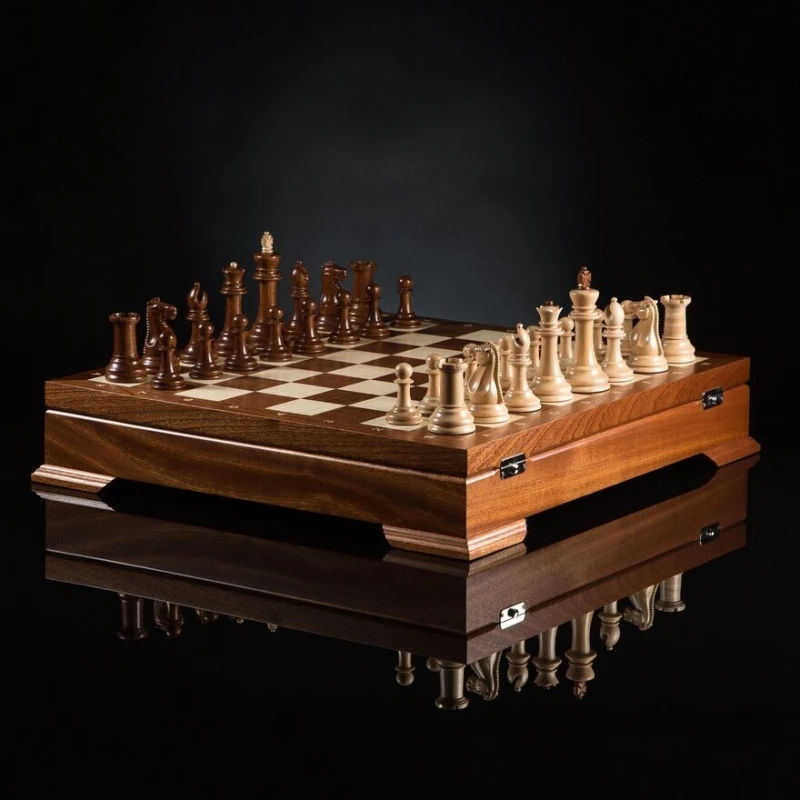 мягкий глубокий ложемент из бархата с ячейками для каждой фигуры, крышка открывается и удерживается в вертикальном положении петлями с ограничителем, ножки доски подклеены замшем.
