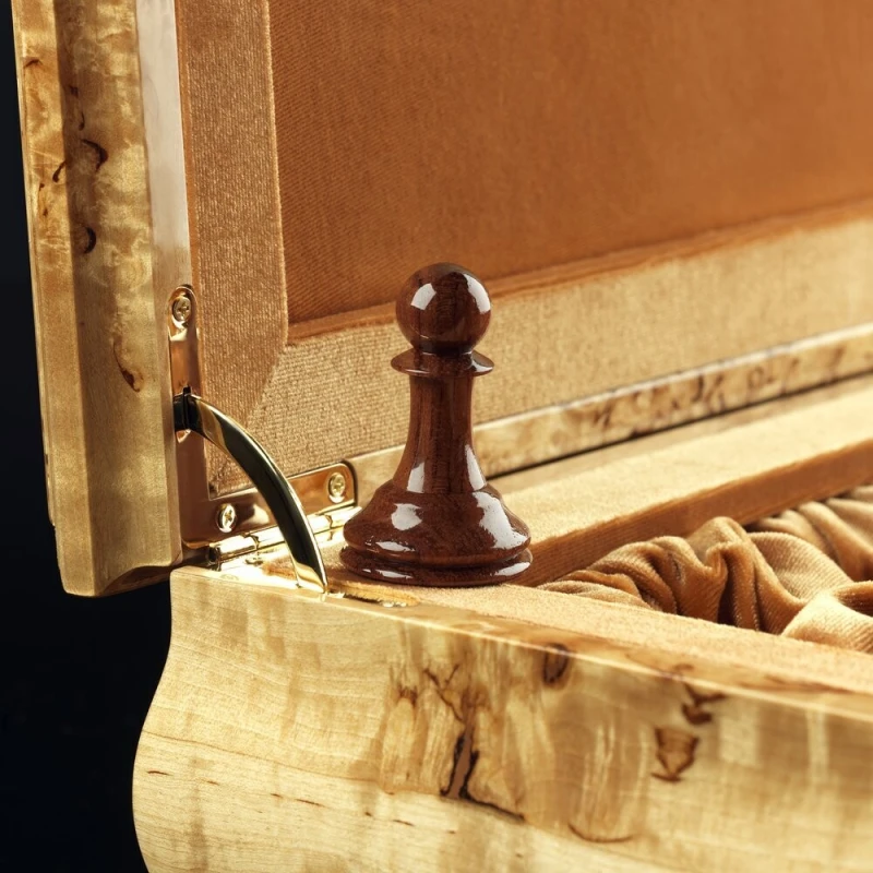 мягкий глубокий ложемент из бархата с ячейками для каждой фигуры, крышка открывается и удерживается в вертикальном положении петлями с ограничителем, ножки подклеены замшей.
