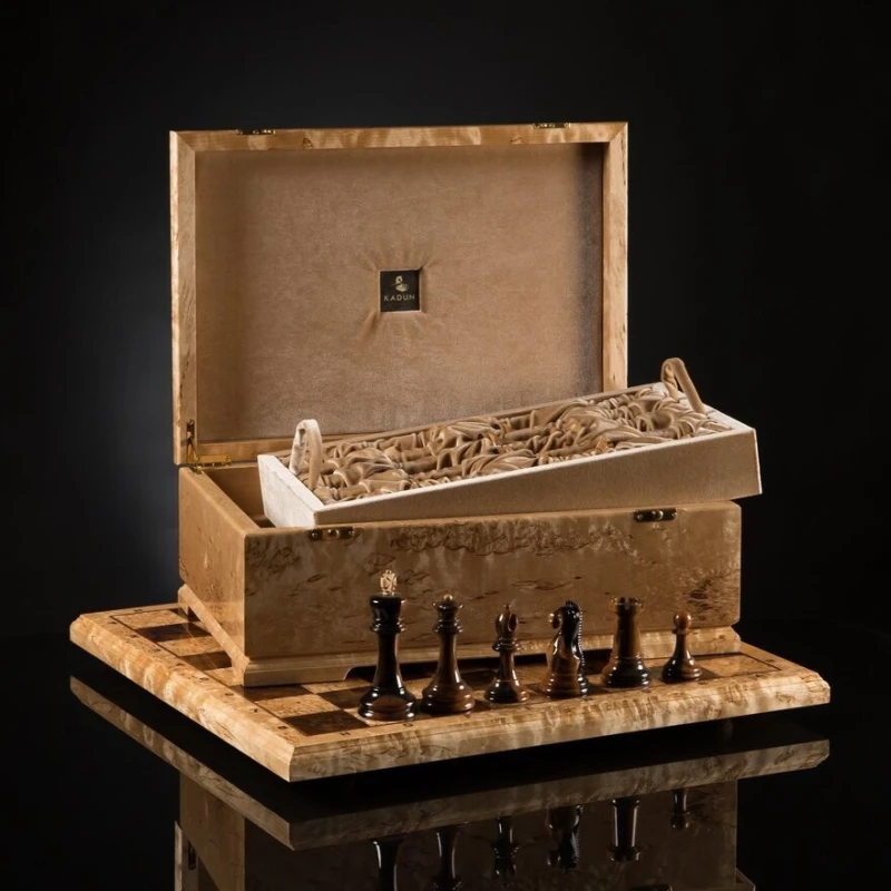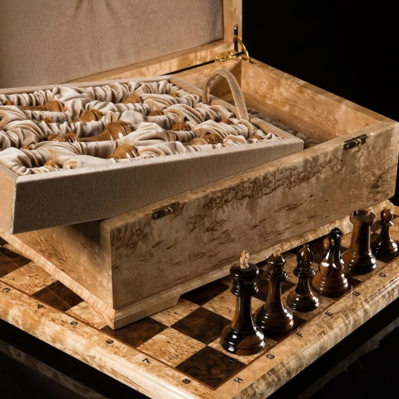 - Материал доски:шахматное поле - отделка рояльным лаком клетка светлая – карельская береза клетка темная - корень ореха буквы – клен птичий глаз корпус - массив карельской березы