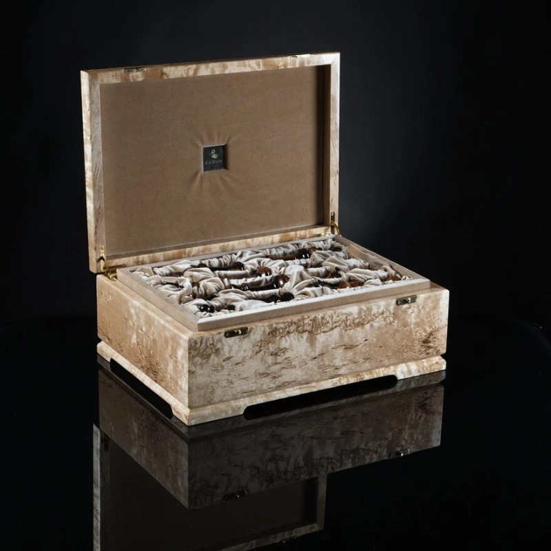 - Упаковка:Шкатулка для фигур корпус - массив карельской березы, 2 лотка для темных и светлых фигур мягкий глубокий ложемент из бархата с ячейками для каждой фигуры, крышка открывается и удерживается в вертикальном положении петлями с ограничителем, ножки подклеены замшем. Коробка из льна ручной работы