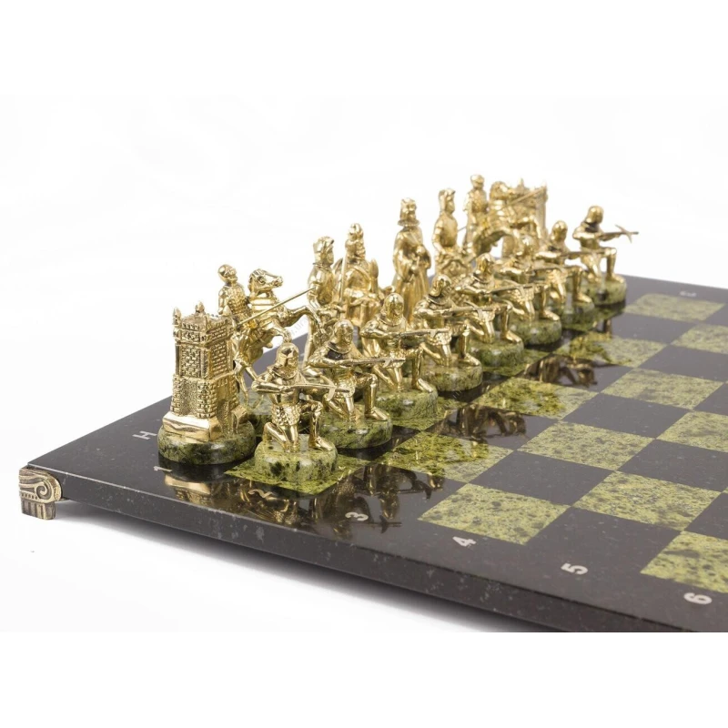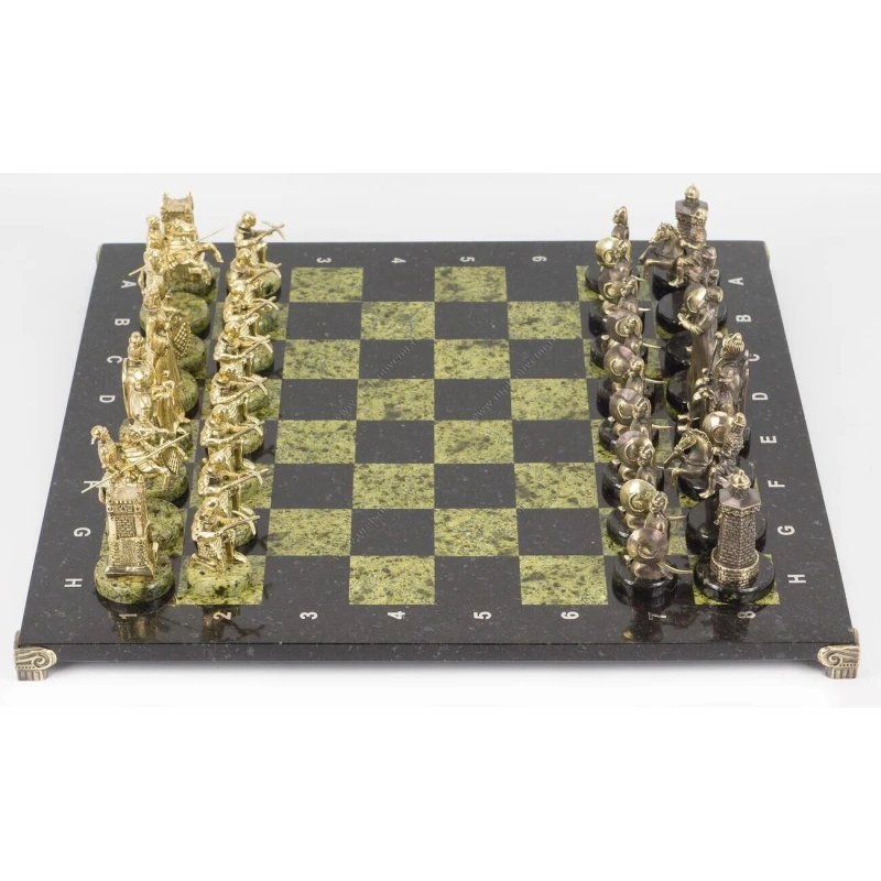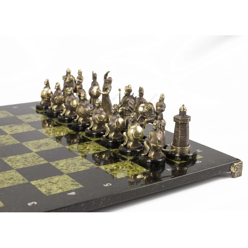 Доска из змеевика, фигуры из бронзы. Размер: доска 480х480 мм, клетка 50х50 мм, высота фигур 65-95 мм.