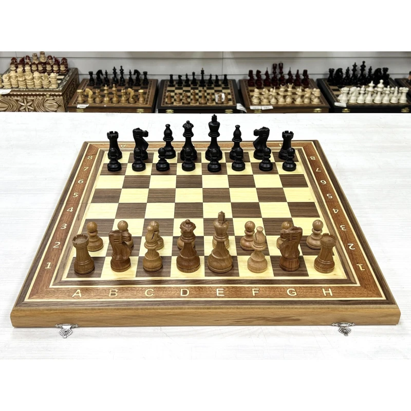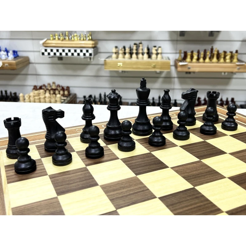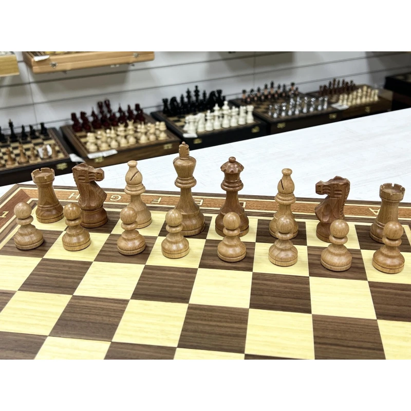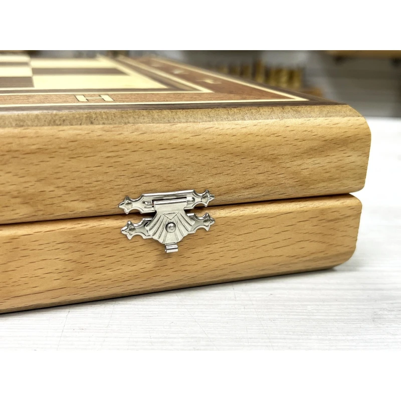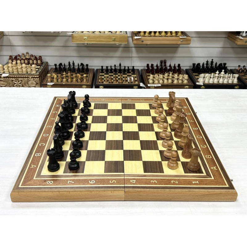 Высота короля 9.5 см. Высота пешки 4.5 см. Шахматные фигуры с утяжелением. Размер доски в разложенном виде 50 на 50 см. Шахматное поле сделано в технике маркетри их ореха и ясеня. Классический дизайн шахматных фигур в стиле Стаунтон идеально подойдет в подарок для детей и взрослых. Внутри доска покрыта тканью. Ручная работа. Материал фигур бук. Каждая фигура с подклейкой.