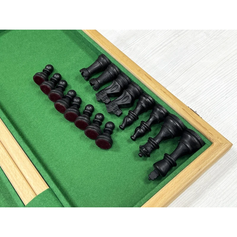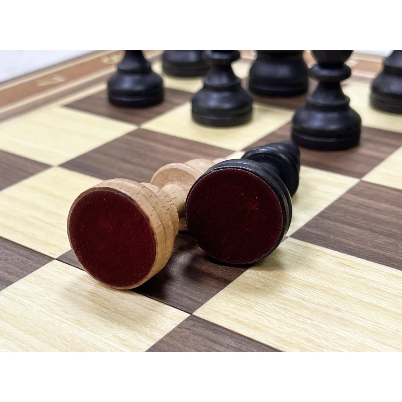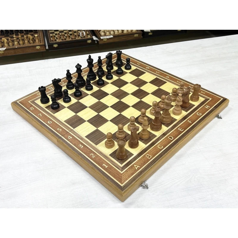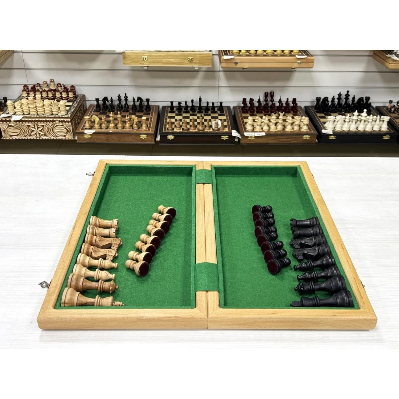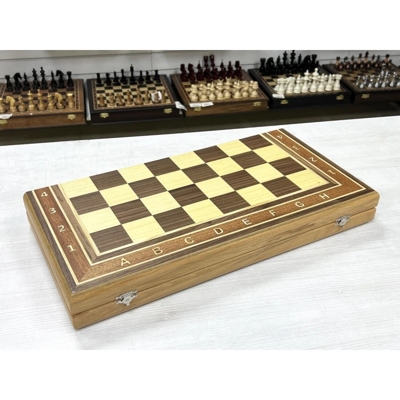 Высота короля 9.5 см. Высота пешки 4.5 см. Шахматные фигуры с утяжелением. Размер доски в разложенном виде 50 на 50 см. Шахматное поле сделано в технике маркетри их ореха и ясеня. Классический дизайн шахматных фигур в стиле Стаунтон идеально подойдет в подарок для детей и взрослых. Внутри доска покрыта тканью. Ручная работа. Материал фигур бук. Каждая фигура с подклейкой.
