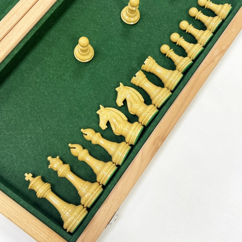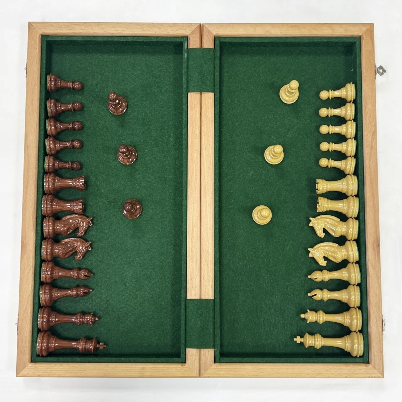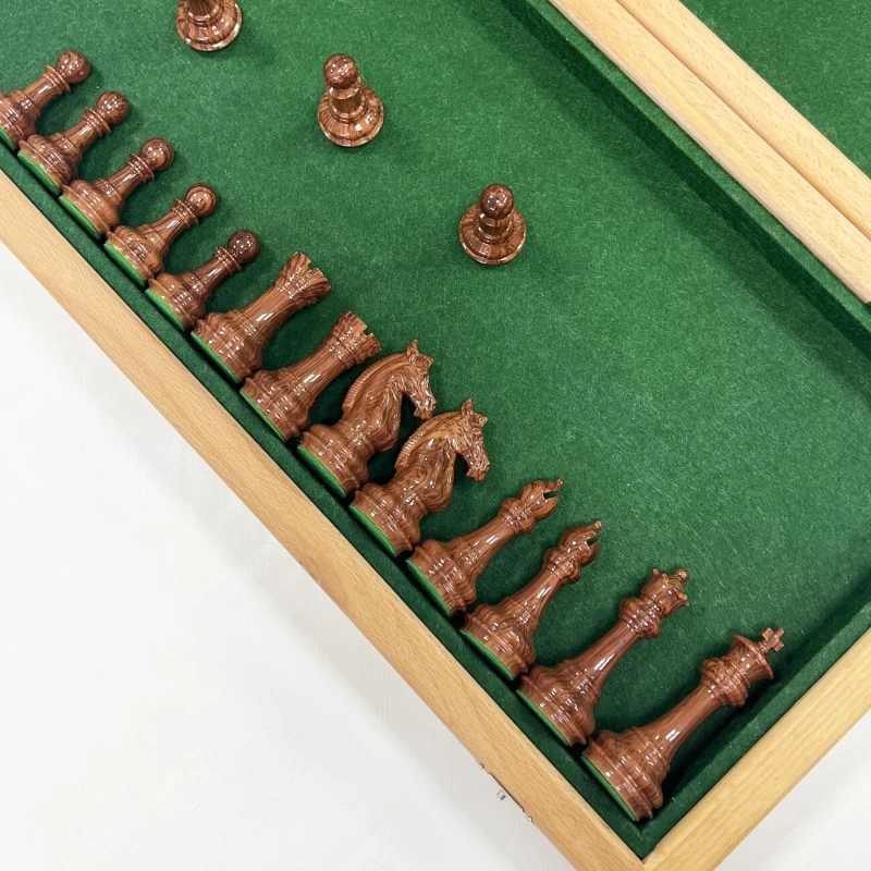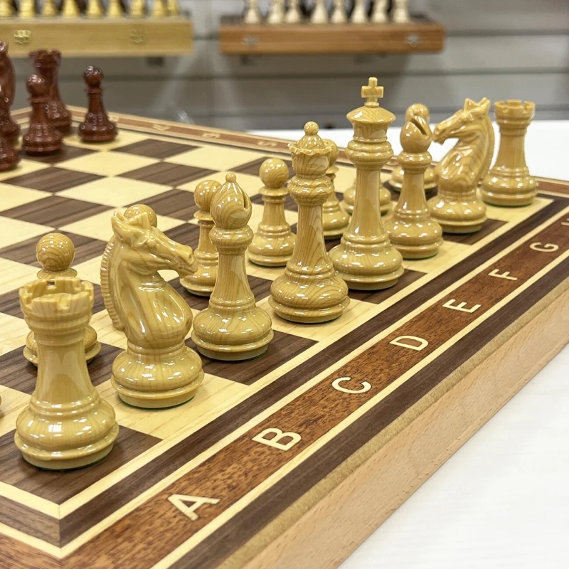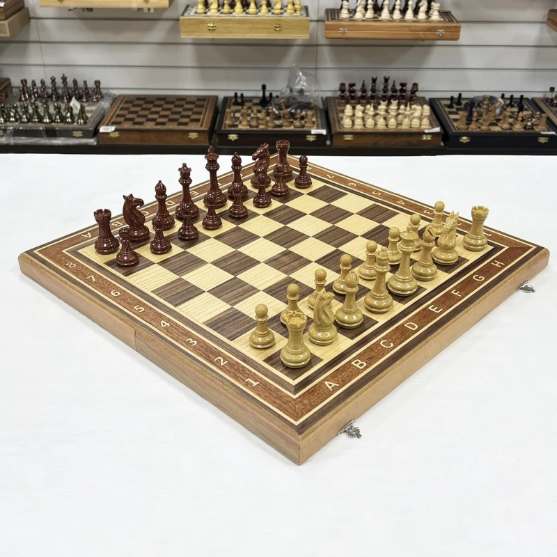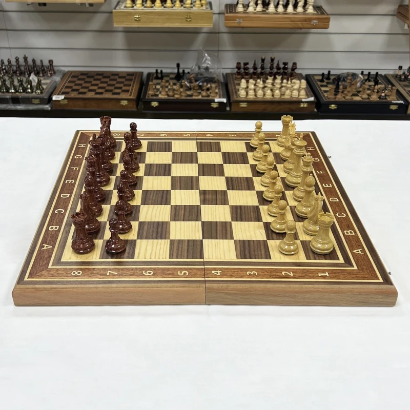 Это уникальная шахматная доска ручной работы, выполненная из шпона ореха в технике маркетри. Размер доски составляет 50 на 50 см, что обеспечивает комфортную игру и эстетичное оформление. Каждая клетка тщательно инкрустирована и гармонично сочетается с натуральной текстурой орехового шпона, создавая изысканный дизайн и теплую атмосферу. В комплект входят классические шахматные фигуры, изготовленные из композитного материала, что гарантирует долговечность и высокое качество. Размер короля — 10 см, а пешки — 3,8 см, что идеально подходит для классической игры и гармонирует с размерами доски. Этот набор станет стильным украшением интерьера и приятным подарком для ценителей шахмат и искусства ручной работы.