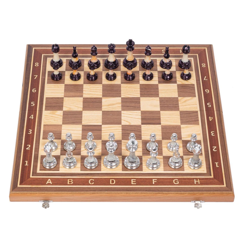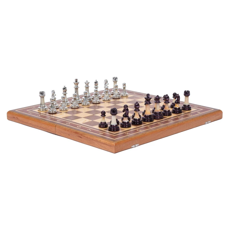 Подарочные шахматы с необычными фигурами с утяжелением на большой доске из красного дерева, ореха, бука и ясеня. Размер доски 50 на 50 см. Гроссмейстерский размер. Высота короля 9 см, фигуры утяжеленные. Приятно держать в руке. Размер клетки 5 на 5 см. Высота пешки 5 см. Фигуры с подклейкой из экокожи. Шахматное поле собирается в технике маркетри.