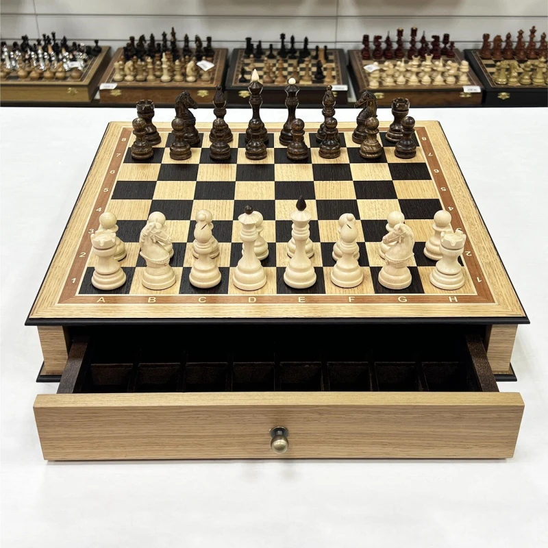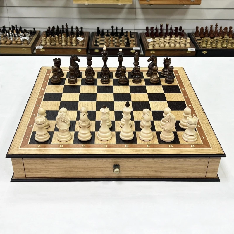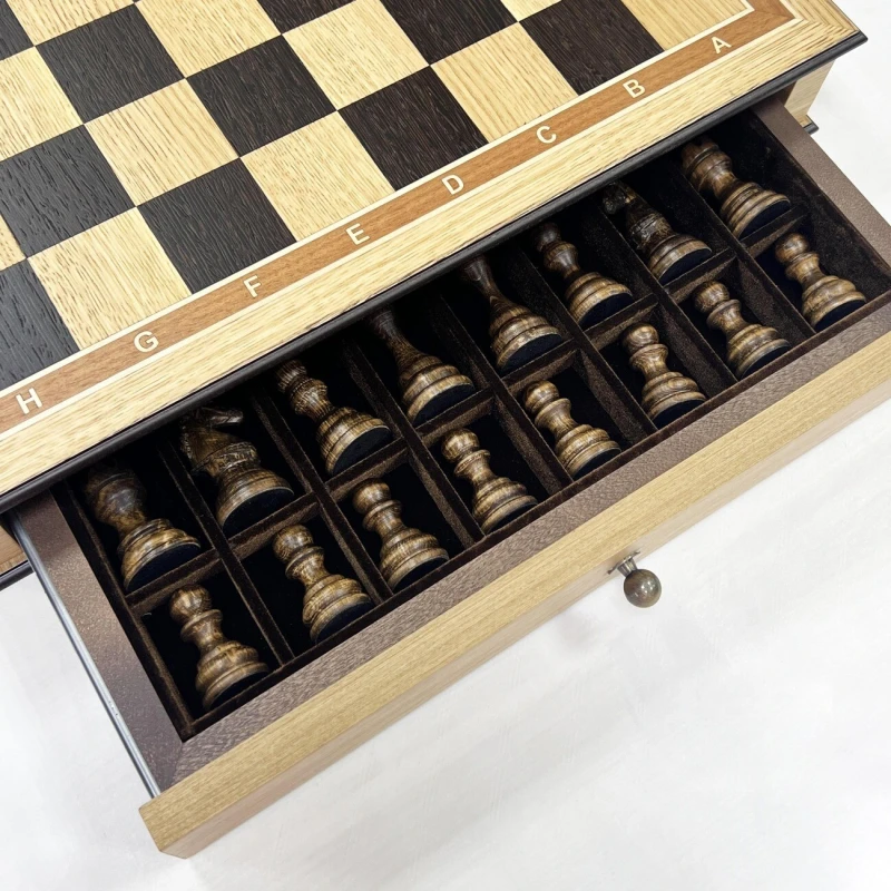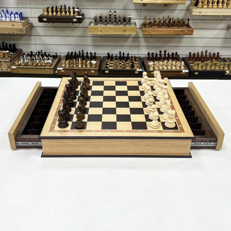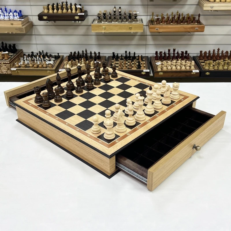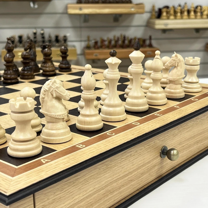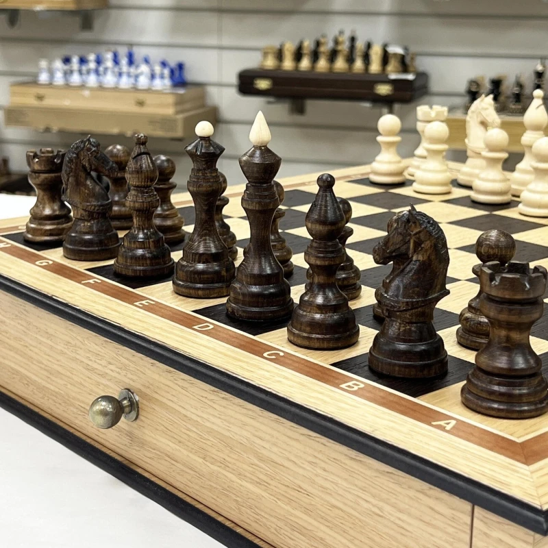Размер доски достаточно большой 48 на 48 см. Размер клетки 5 на 5 см. Шахматная доска сделана в виде ларца с ячейками в выдвижных ящиках для бережного хранения фигур. Шахматное поле собирается вручную из венге и дуба. Шахматные фигуры выполнены в классическом стиле с резными элементами и высокой детализацией коней. Фигуры утяжеленные. Высота короля 9.5 см, высота пешки 5 см. Подойдут в качестве подарка для мужчин и женщин, хорошо впишутся в любой интерьер кабинета, квартиры или загородного дома. Классический дизайн шахмат Бастион позволяет обучать детей и начинающих игроков.