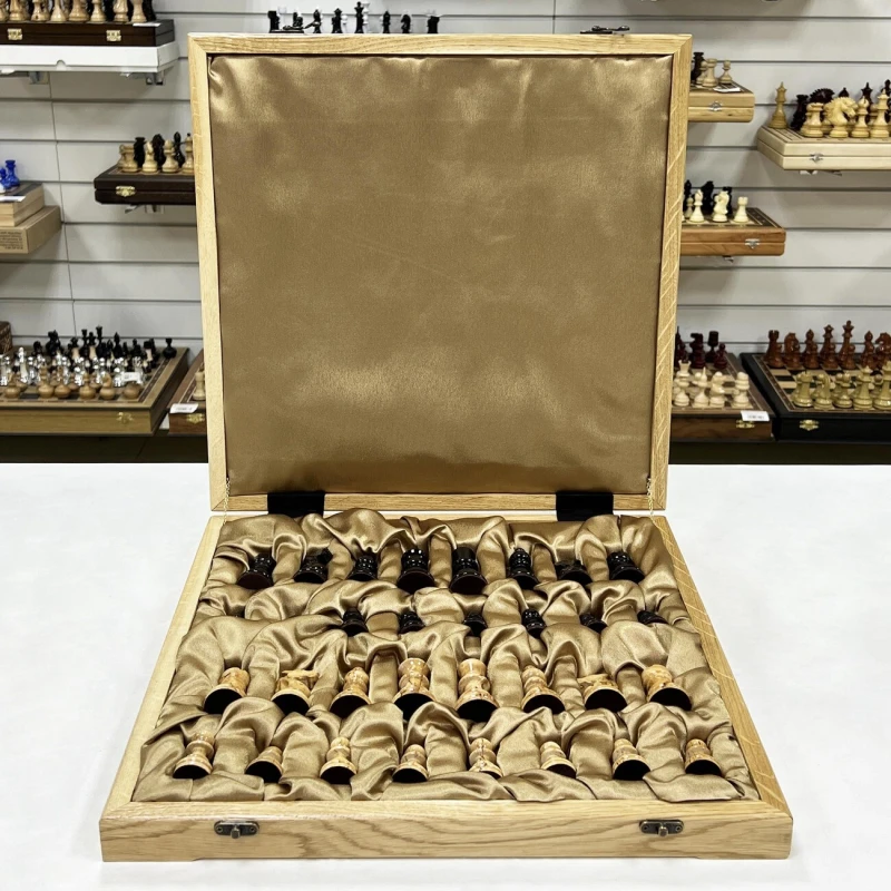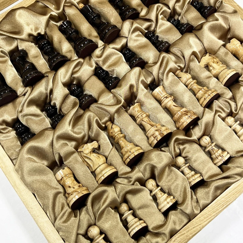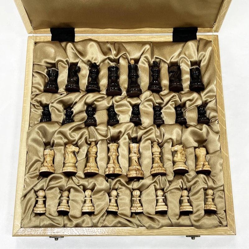 Красивые шахматы ручной работы с фигурами из карельской березы на доске в виде ларца с ячейками для индивидуального хранения фигур. Размер доски 42 на 42 см. Высота короля 8.5 см. Шахматные фигуры сделаны в стиле Стаунтон. Материал доски дуб или граб (нужно уточнять). Сделаны в России. Фигуры покрыты глянцевым лаком. Хорошо впишутся в любой интерьер квартиры или загородного дома.