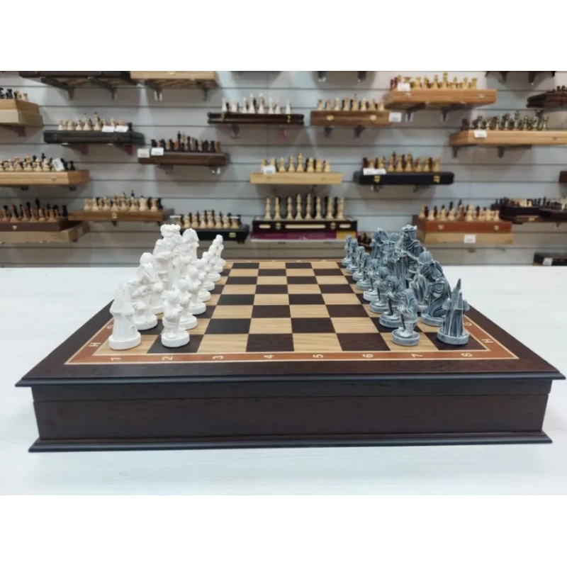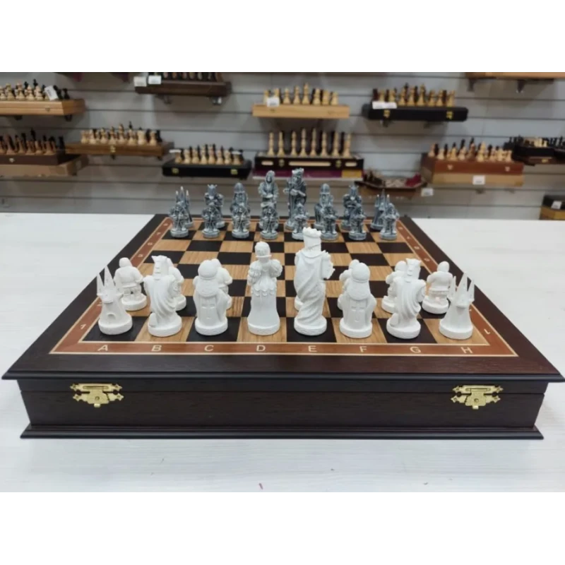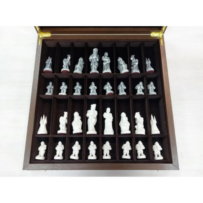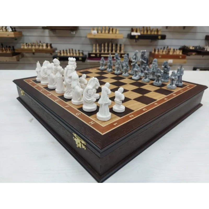 Эти шахматы являются подарочными, так как они поставляются в специальном ларце или же другими словами в шкатулке или ящике как удобнее. Такой дизайн позволяет сохранить фигуры от повреждений и пыли, а также делает этот комплект удобным для переноски.