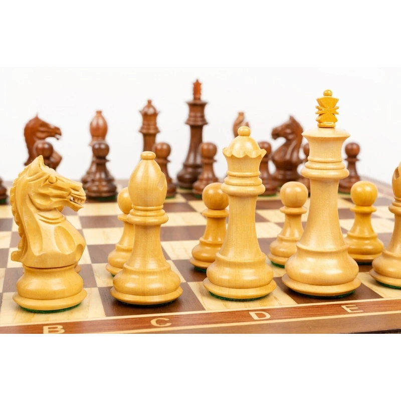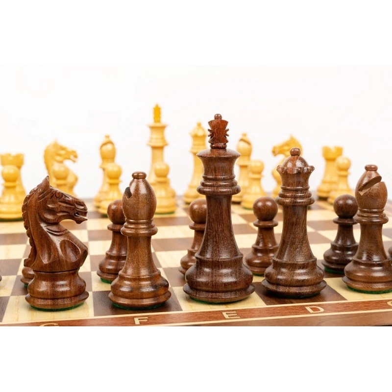 Данные шахматные фигуры на наш скромный взгляд, одни из лучших на рынке. Вес комплекта данных фигур – около 2 килограммов. Фигуры выполнены утяжеленными, что придает им дополнительную устойчивость на доске. Произведены данные фигуры в Индии и выполнены из редких для нашей страны пород дерева: светлые фигуры из самшита, а темные – из эбонированного палисандра. Шахматная фигура «Конь» - визитная карточка данных фигур, выполнена полностью вручную виртуозными индийскими мастерами.