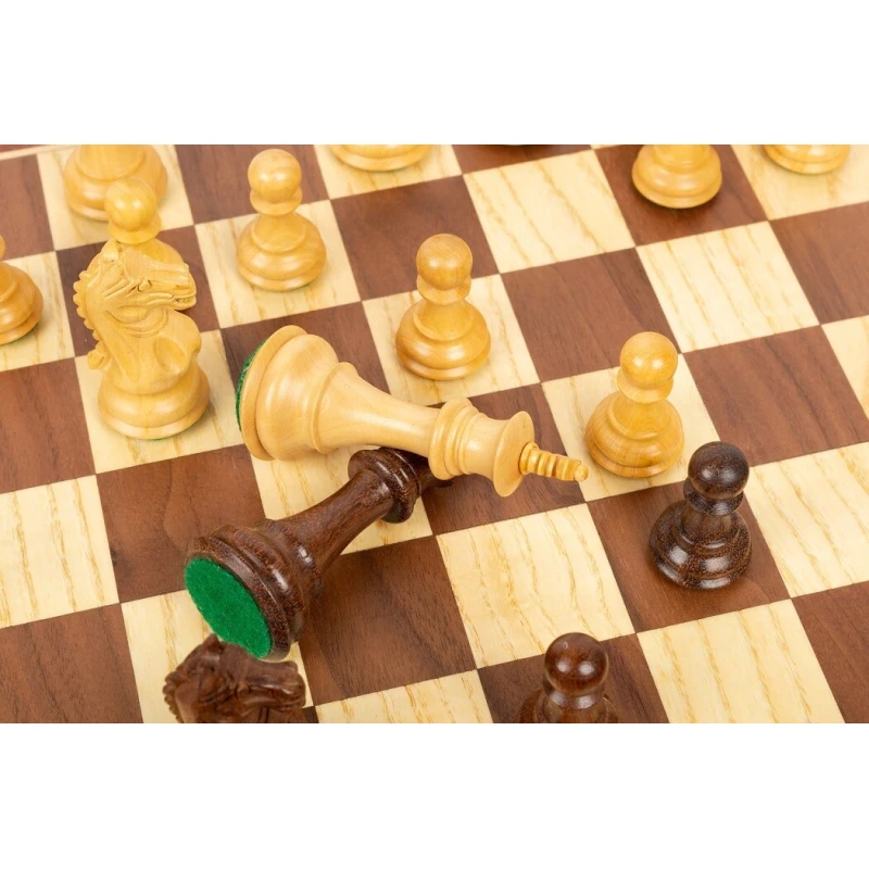 Шахматная доска – основа для игры в шахматы. Каркас данной модели доски выполнен из бука, а ее игровое поле покрыто шпоном различных ценных пород дерева, (орех, светлый ясень, и прочее). Никакой цветной печати - каждый элемент доски, будь то клетка, цифры или буквы, а также поля доски выполнены из дерева.