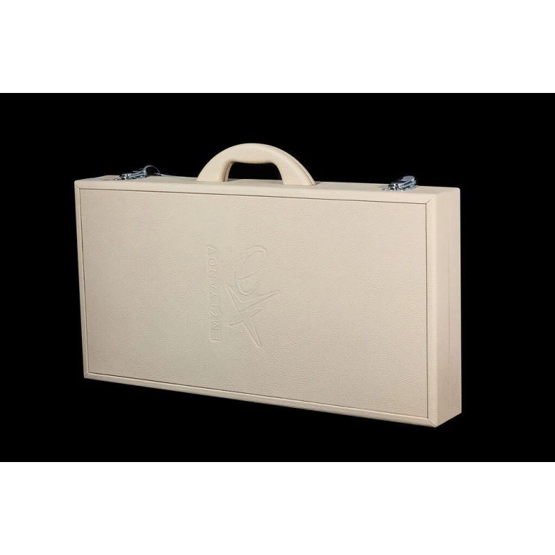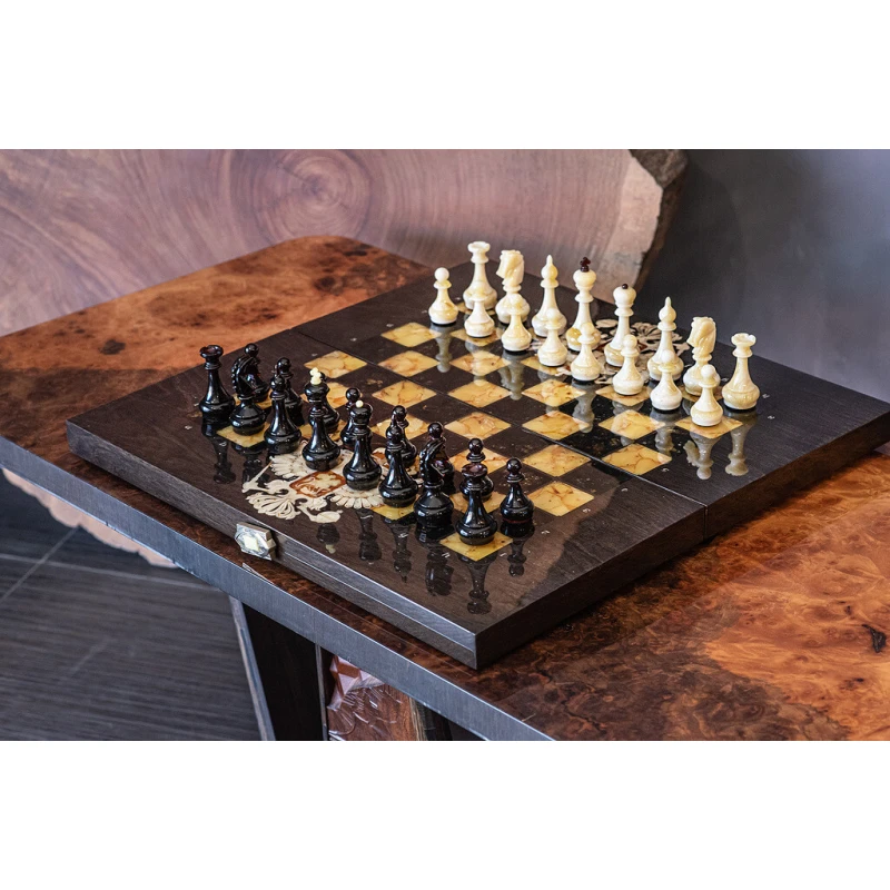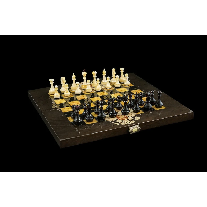 Эксклюзивные янтарные шахматы ручной работы на доске из мореного дуба. Размер доски в разложенном виде 51 на 56 см. Упакованы в чемодан.