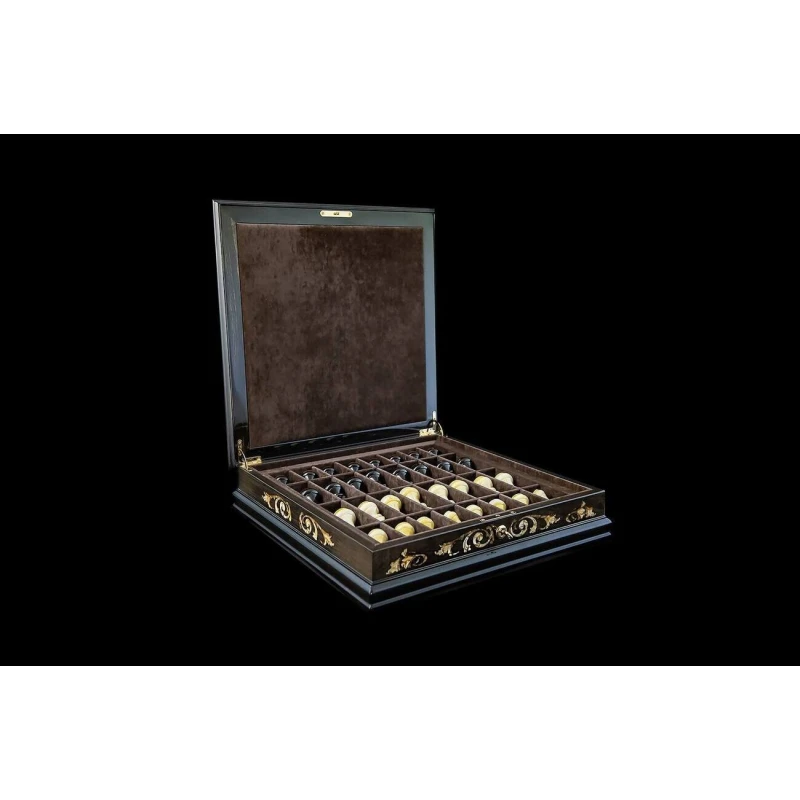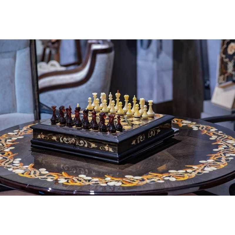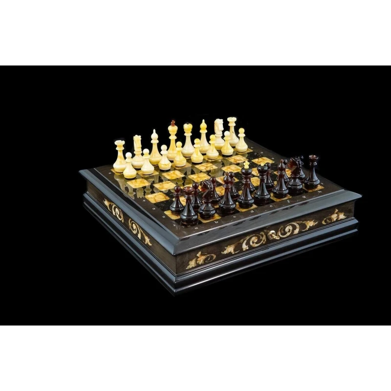 Эксклюзивные шахматы ручной работы из мореного дуба и янтаря. Размер доски 45 на 45 см. Упакованы в чемодан. Материал фигур композит. Внутри фигуры лежат в отдельных ячейках.