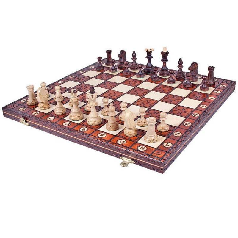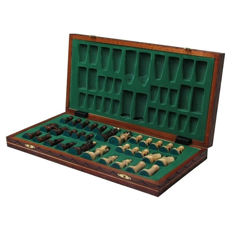 Шахматы "Юниор", Wegiel – коллекционный набор классической настольной игры, выполненный в традиционном стиле. Фигуры, выполненные из цельного массива липы, внутри имеют металлический стержень, который работает как утяжелитель. Сверху каждая фигура покрыта лаком. Доска, сделанная из того же материала, оснащена износостойкой медной фурнитурой. Благодаря этому обеспечивается долговечность изделия, его устойчивость к активной эксплуатации. Внутренняя сторона доски имеет специальные ячейки, индивидуальные для каждой фигуры, чтобы обеспечить им сохранность при хранении и транспортировке.