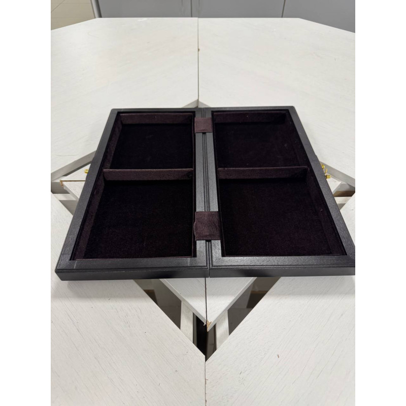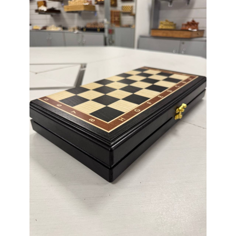 Турнирная шахматная доска без фигур из дерева. Размер доски в разложенном виде 40 на 40 см. Размер доски в сложенном виде 40 на 20 см. Размер клетки 4 на 4 см. Шахматная доска собирается вручную в технике маркетри из ценных пород дерева. Сделана в России. Внутри доска покрыта бархатом. Подойдет для фигуры с диаметром основания до 3.8 мм.