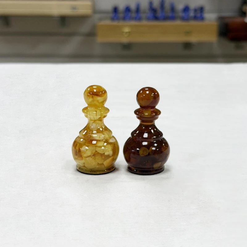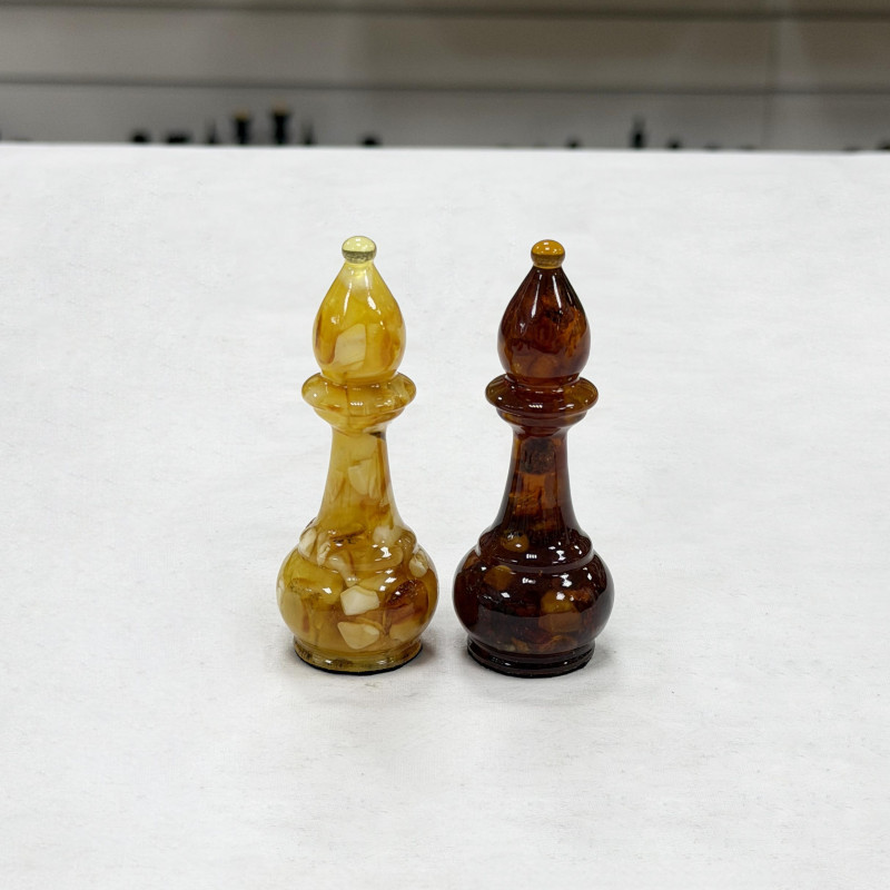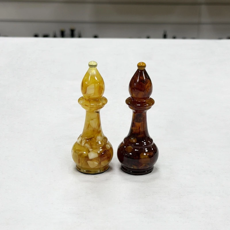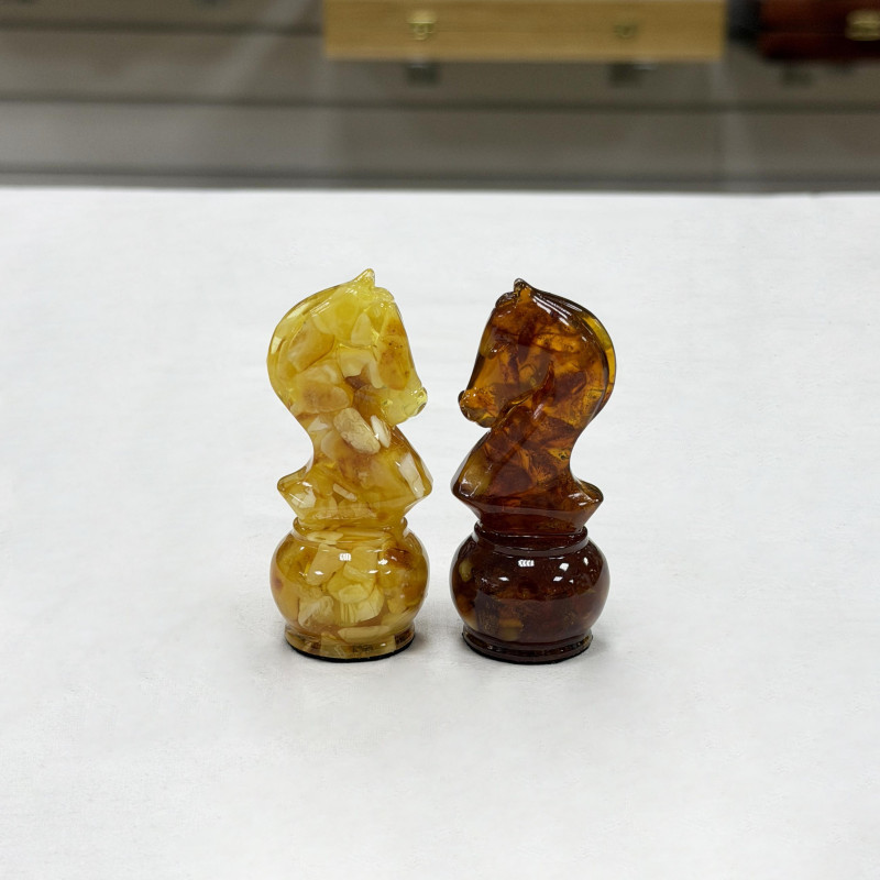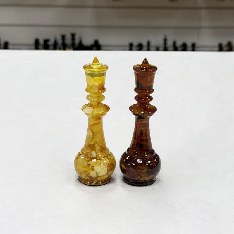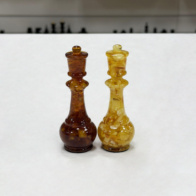 Элегантные шахматные фигуры из янтаря и эпоксидной смолы отражают гармонию природы и современного мастерства. Высота короля составляет 11 см, а диаметр его основания — 4 см, что придает фигурам внушительный и изящный вид. Пешки - 6 см с основанием диаметром 3,5 см, гармонично дополняя общую композицию. Все фигуры утяжелены и надежно подклеены у основания, затем аккуратно обтянуты тканью, что обеспечивает устойчивость и приятное тактильное ощущение при игре. Такой комплект станет не только функциональным аксессуаром для шахматных партий, но и ярким декоративным элементом, подчеркнувшим вашу индивидуальность и вкус к искусству.