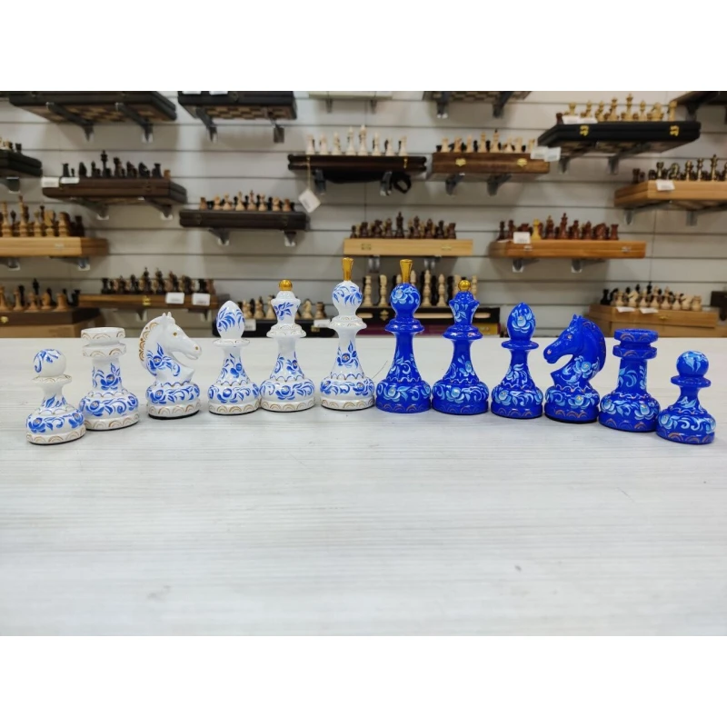 Эксклюзивные шахматные фигуры из кавказского граба с утяжелением. Каждая фигуры расписывается вручную в технике Гжель. Покрыты лаком. В основании фигур есть подклейка из бархата. Благодаря утяжелению фигуры устойчив на доске. Высота короля - 10 см (диаметр основания 3,5 см). Высота пешки - 5 см (диаметр основания 3 см). Подойдут для шахматных досок с клеткой 4.5 на 4.5 см, 5 на 5 см, 5.5 на 5.5 см. Уникальность шахматных фигур в красивом резном коне, в сочетание с художественной росписью предают неповторимый внешний вид. Отлично впишут в любой интерьер. Форма фигур близка к классическим Стаунтон, поэтому дети и взрослые с легкостью смогут обучаться шахматам.