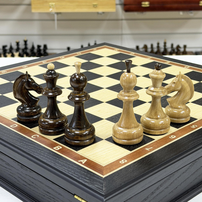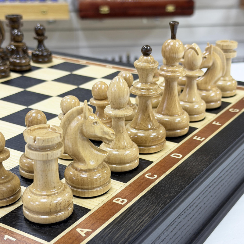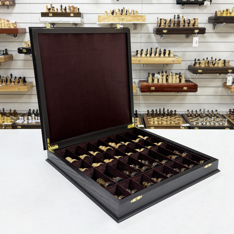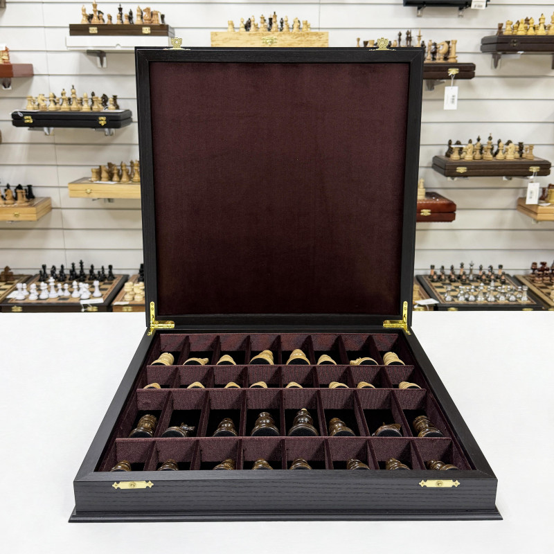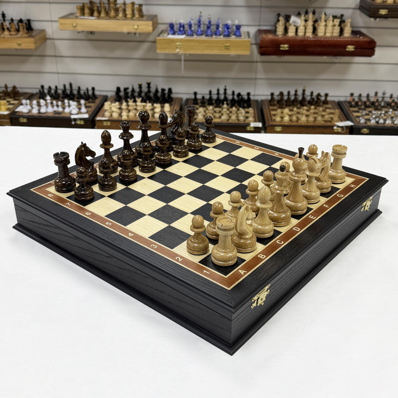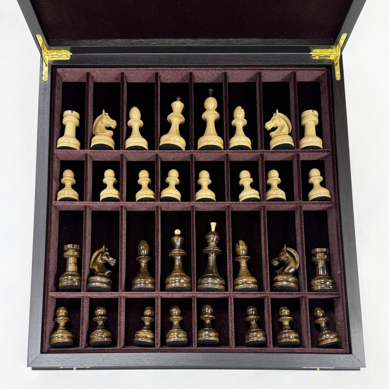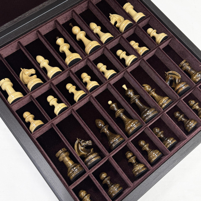 Шахматный набор состоящий из лареца ручной работы и фигур из кавказского граба. Ларец выполнен в технике маркетри, Темная клетка - мореный дуб, светлая - ясень. Размер клетки 4.5х4.5 см размер ларца 45х45см. Внутри шахматного ларца находятся ячейки оббитые бархатом для безопасного хранения фигур.