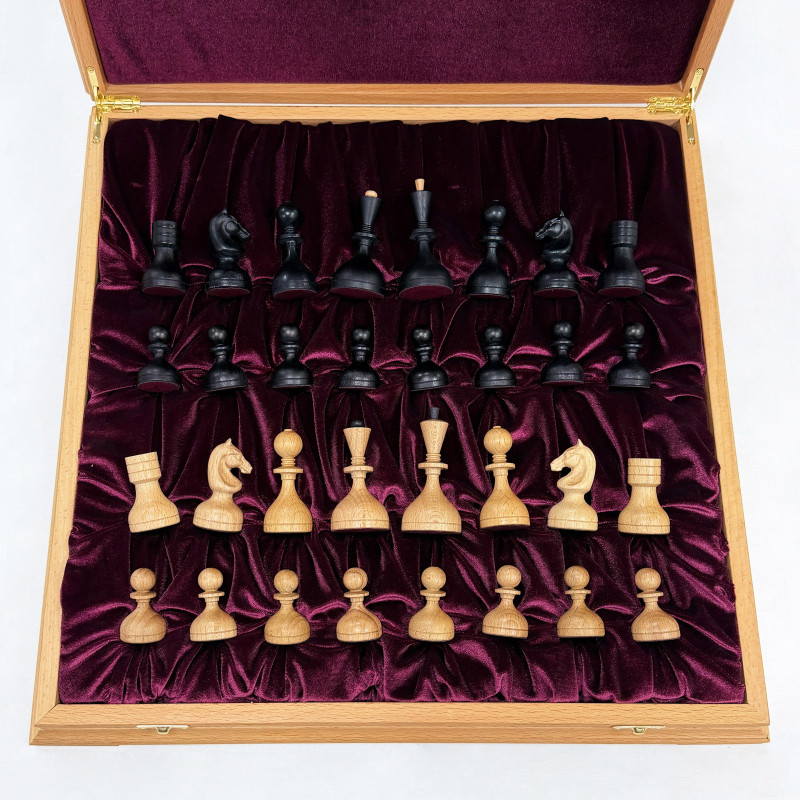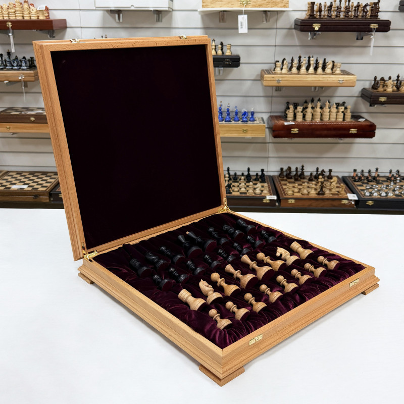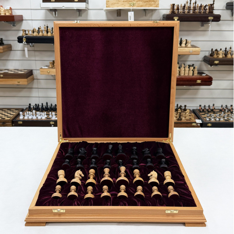 Изысканный шахматный ларец ручной работы из бука станет достойным хранилищем для вашей шахматной коллекции. Размер ларца 43х43 см. Размер клетки - 4.4см. Внутри предусмотрены индивидуальные ячейки для каждой фигуры, отделанные бархатной тканью. В комплекте идут шахматные фигуры из дуба, с утяжеленным основанием и защитной подклейкой. Высота короля - 10 см, высота пешки - 4 см.