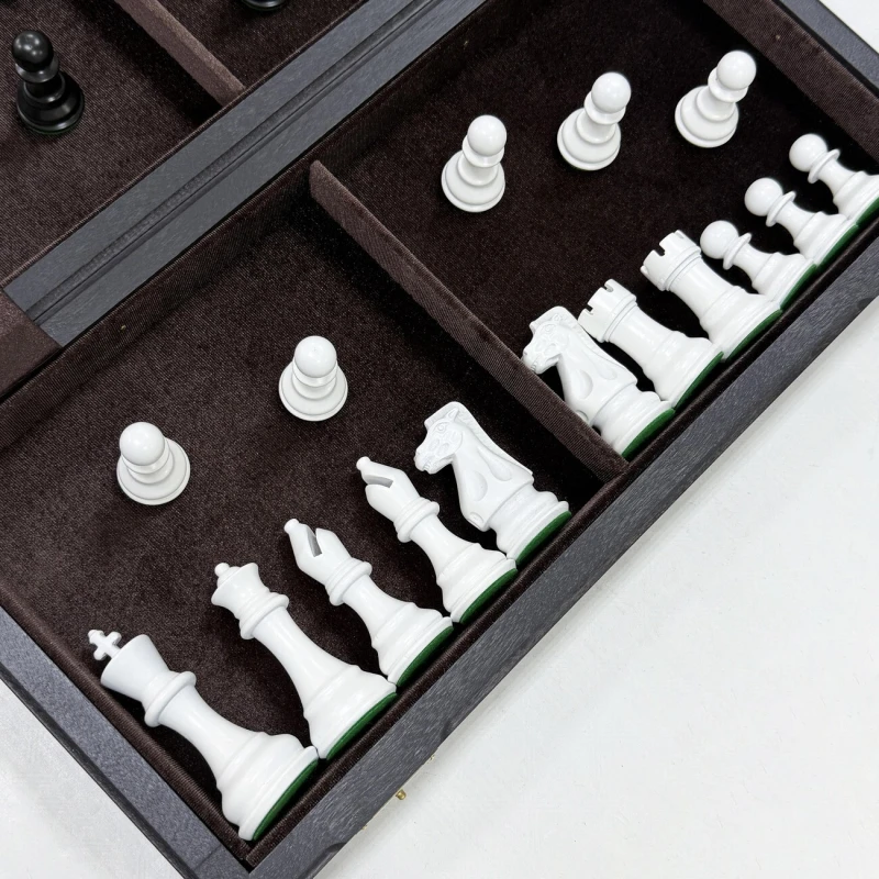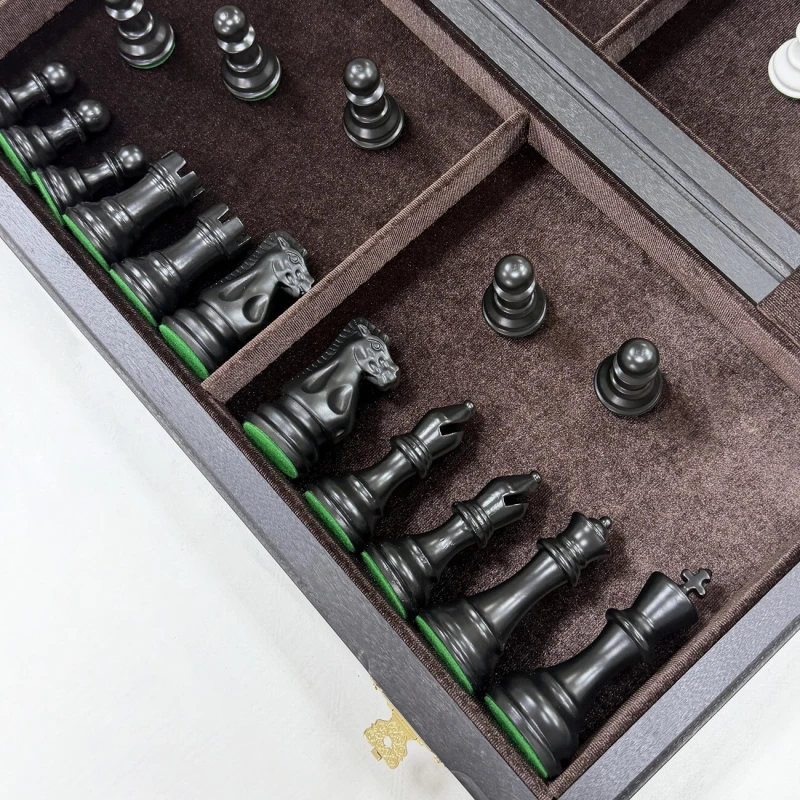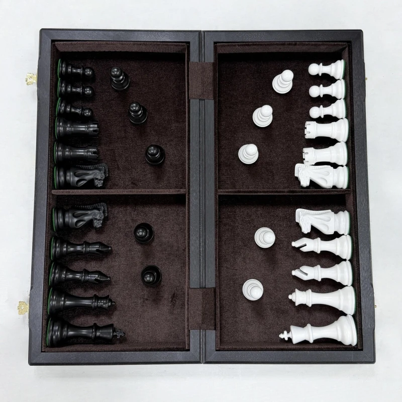 Шахматный набор ручной работы. Складная доска из шпона моренного дуба и ясеня. Внутри бархатная обивка для деликатного хранения фигур. Размер доски 45 х45 см, клетка - 4.5 см. Качественная фурнитура доски и натуральные материалы делает ее долговечной. Шахматные фигуры сделаны из дерева и покрыты черно-белой краской. Фигуры утяжелены и подклеены у основания для предотвращения царапин на игровом поле. Сделано в России.