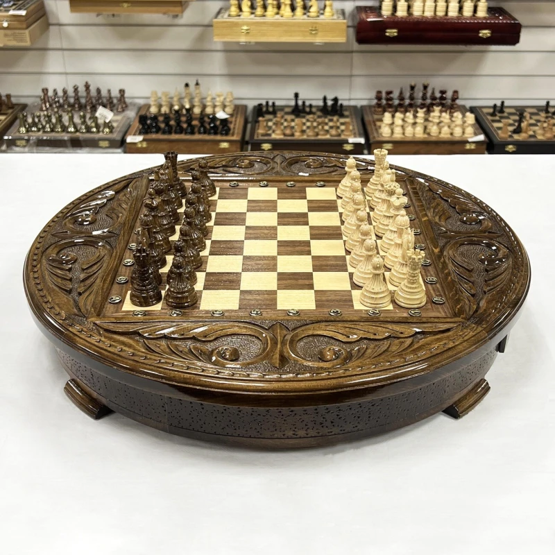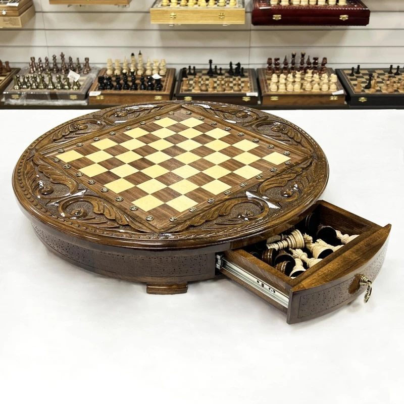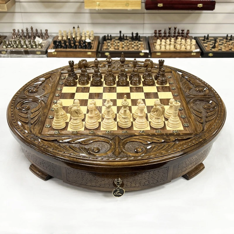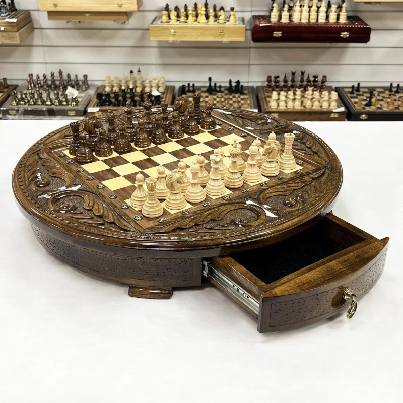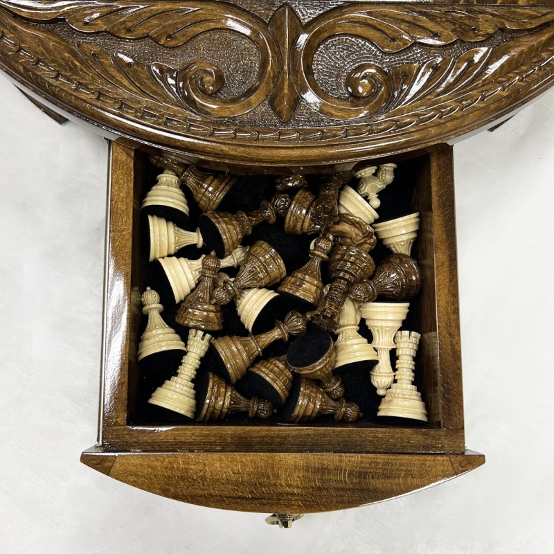 Резные шахматы с выдвижным ящиком - королевский набор для королевской игры. Шахматисты ценят свою игру, потому что она помогает развивать умственные способности, достигая удивительных результатов. Но в то же время для них важна и красота, поэтому наборы вроде этого и привлекают внимание настоящих профессионалов.