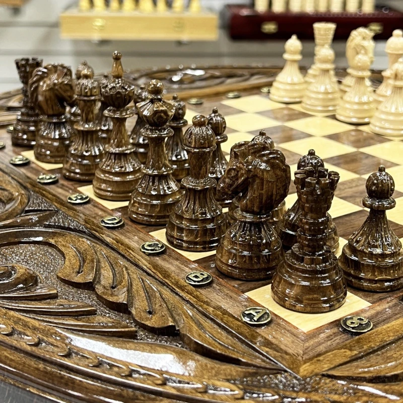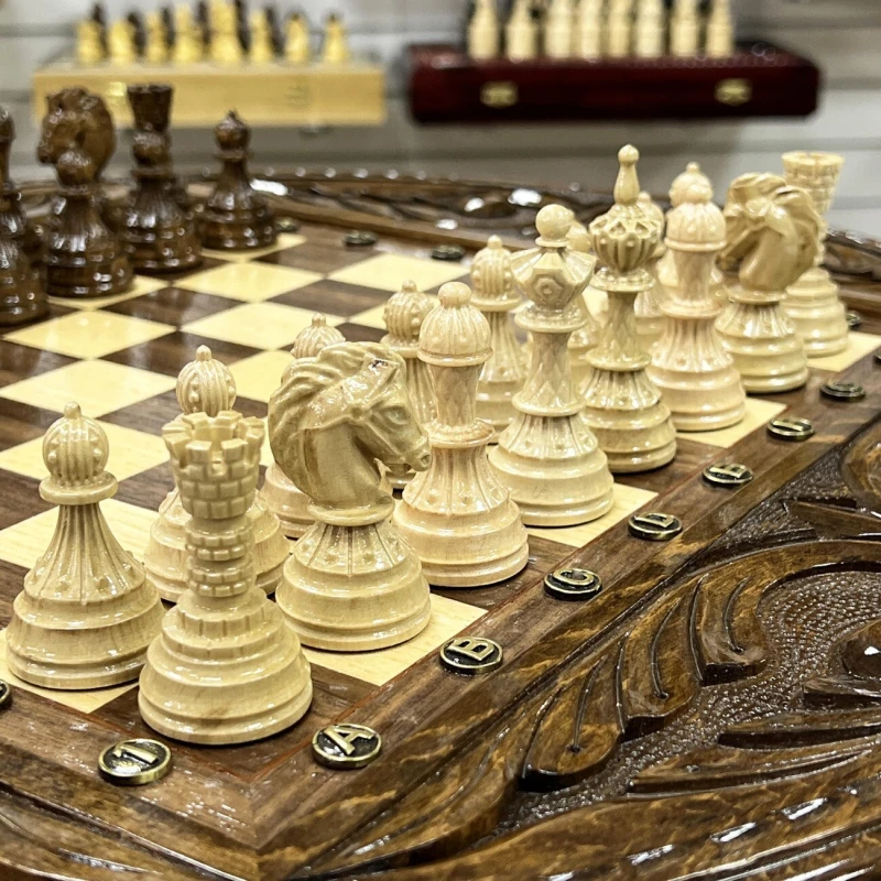 Выполнены м из настоящего бука, что уже выступает гарантией многолетнего срока службы. Игровая поверхность украшена изысканной резьбой с сохранённой древесной структурой, и всё это покрыто лаком, придающим невероятный лоск и роскошность. Комплект включает в себя фигуры, которым тоже уделено немалое внимание, что видно по утонченным элементам и вниманию к деталям. Они не повредят доску, так как снизу имеется мягкая тканевая подложка.