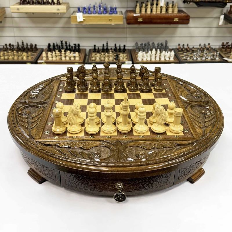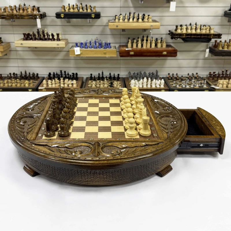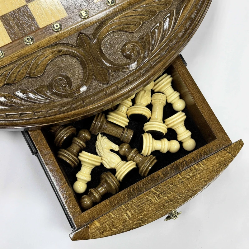Шахматы деревянные с выдвижным ящиком резные Круг люкс