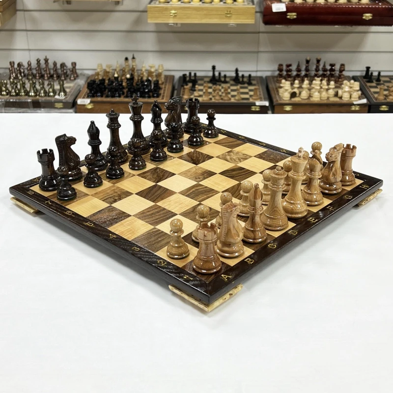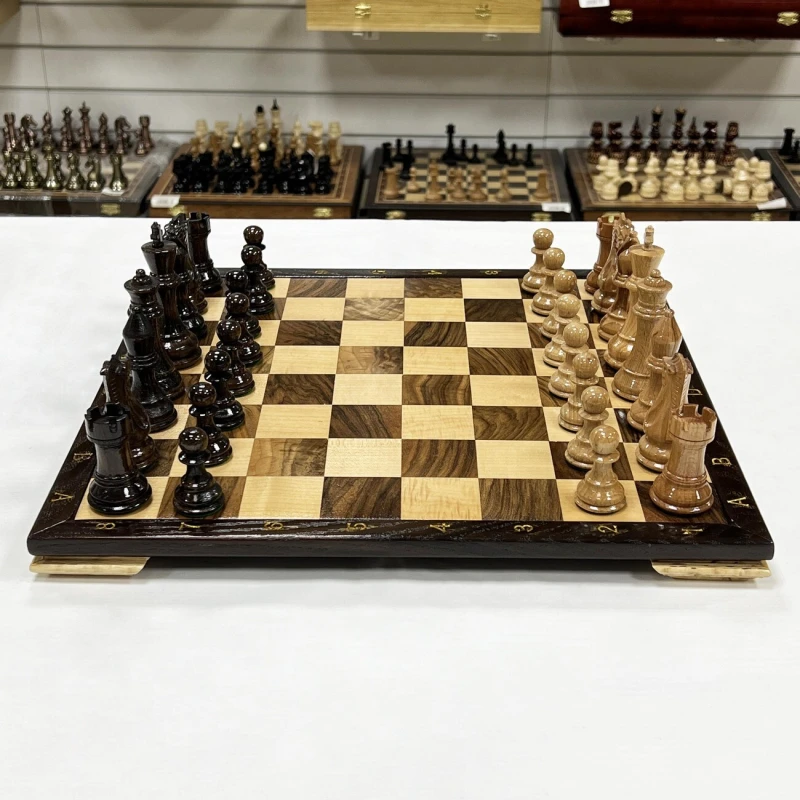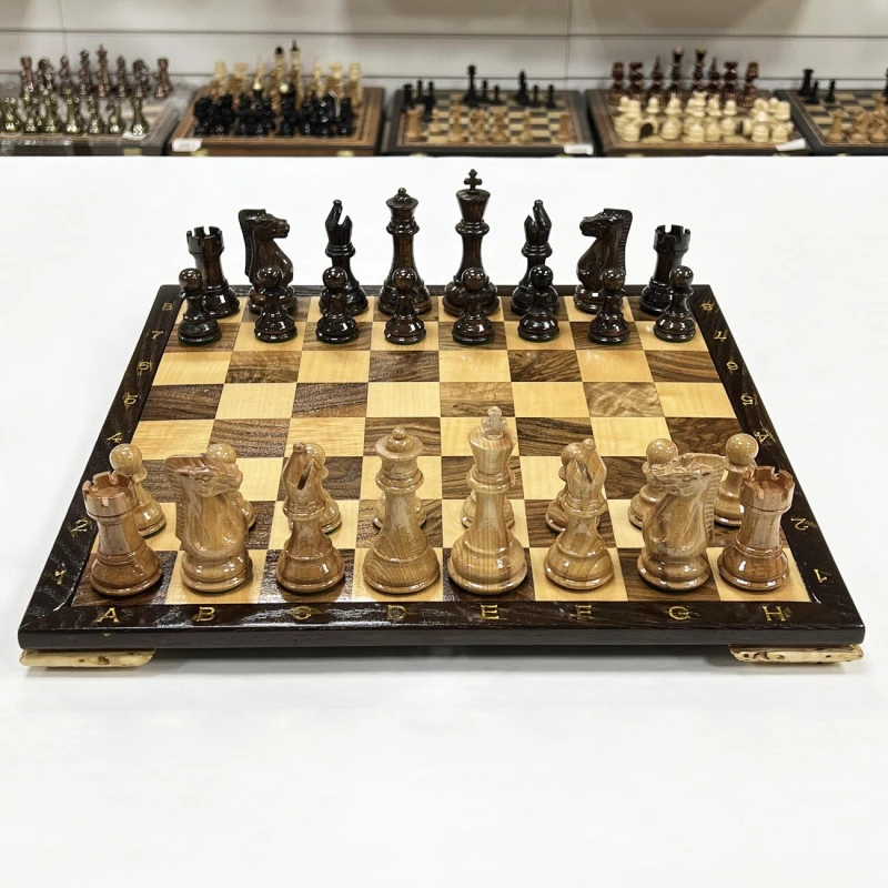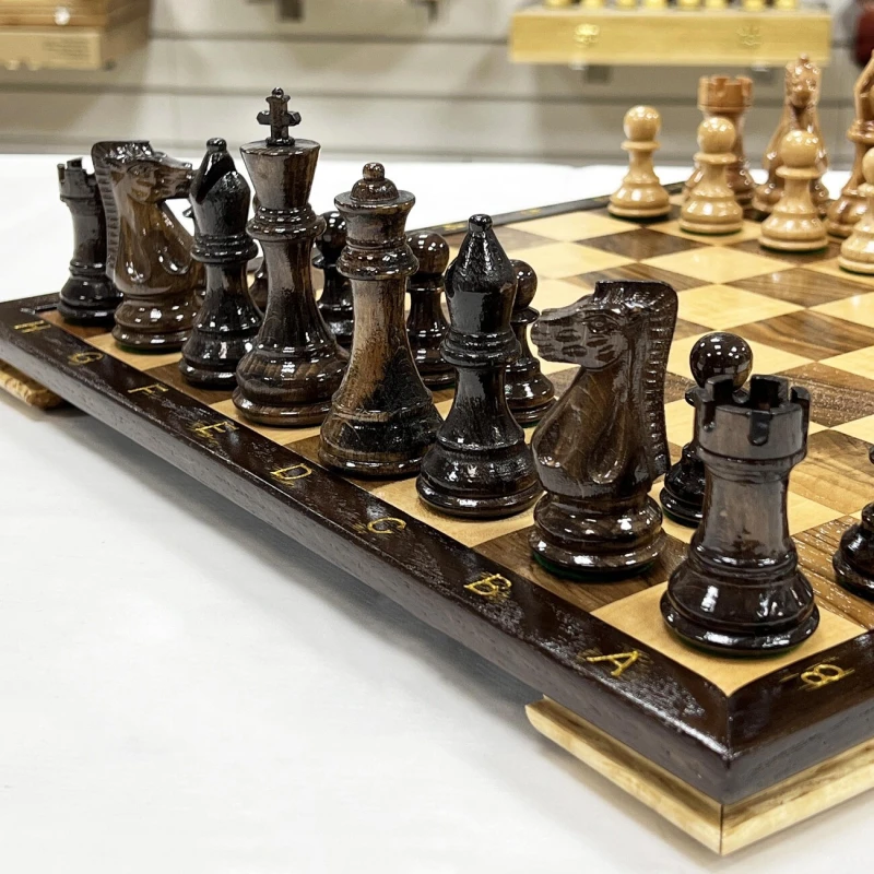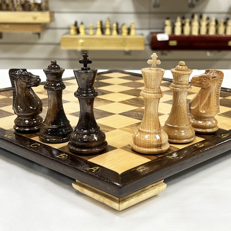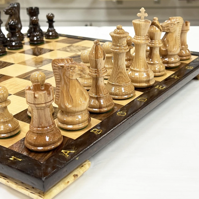 Шахматный набор ручной работы из ореха, клена и дуба. Размер доски (нескладная) 40 х 40 см и высотой 3 см. Полностью ручная работа. Шахматные фигуры ручной работы в стиле классический Стаунтон с утяжелением. Фигуры изготовлены из дуба и покрыты лаком, имеют великолепный внешний вид. и удобные габариты. Высота короля - 10см, высота пешки - 5см. Фигуры утяжеленные и подклеены у основания. Сделаны в России.
