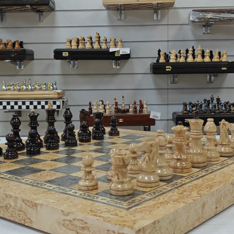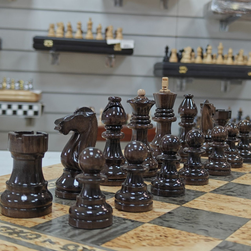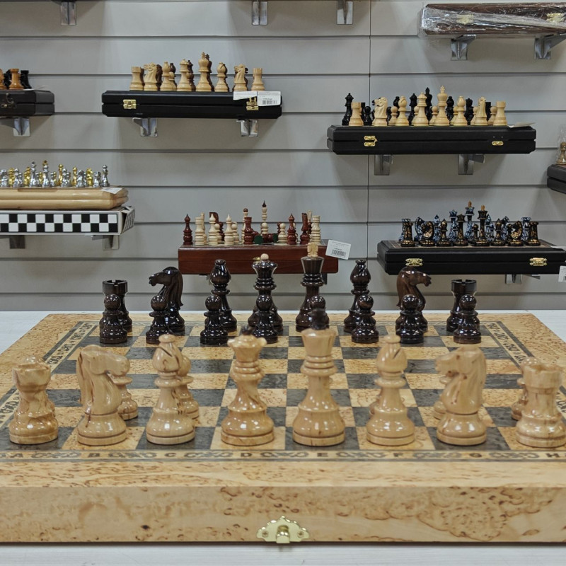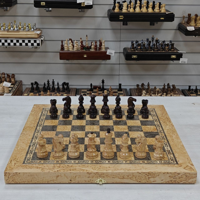 Эксклюзивный шахматный комплект из карельской березы. Доска изготовлена карельскими мастерами методом шпонирования - темная клетка данной доски выполнена из тонированной карельской березы, ее внешний вид превзойдет все ваши ожидания! Размер клетки 4.5см, доски - 48х48см. Фигуры ручной работы в стиле классический Стаунтон с размерами - 8.2 - высота короля, 4.2 - высота пешки. Такой набор станет отличным подарком и подарит незабываемые ощущения от игры в шахматы