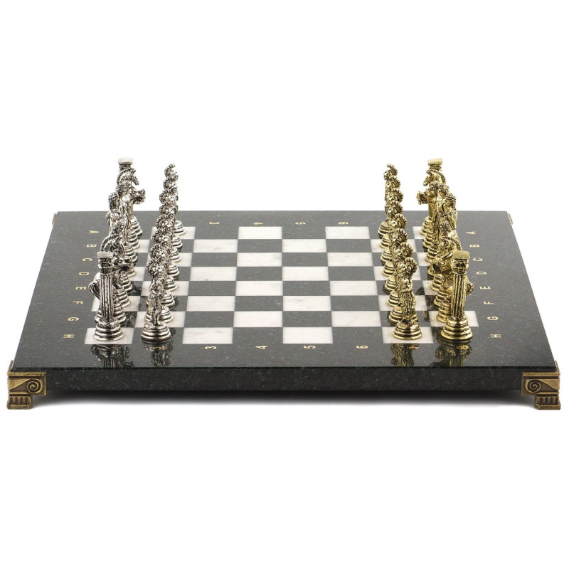 Шахматы изготовлены из натурального камня мрамор фигуры из металла с покрытием под золото и серебро, имеют размеры доски 32х32х3 см см и весят 7 кг. Сувенирные шахматы из камня с красивыми фигурами станут прекрасным подарком на день рождения мужчине, шахматисту или просто любителю игры. В комплекте кейс из экокожи.
