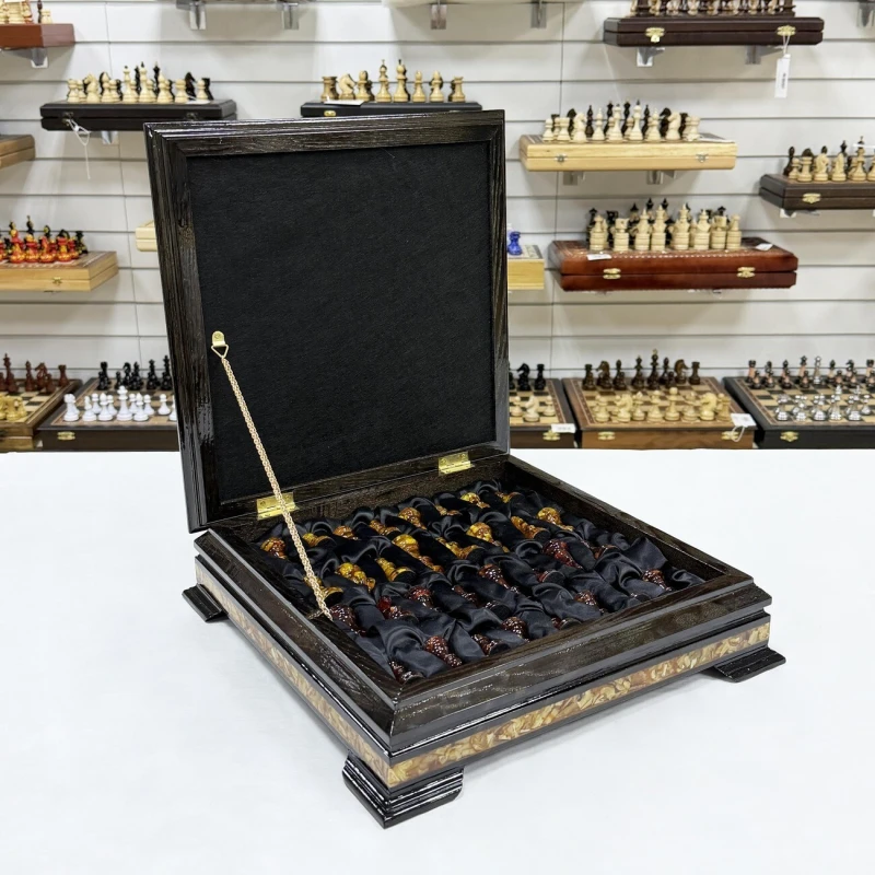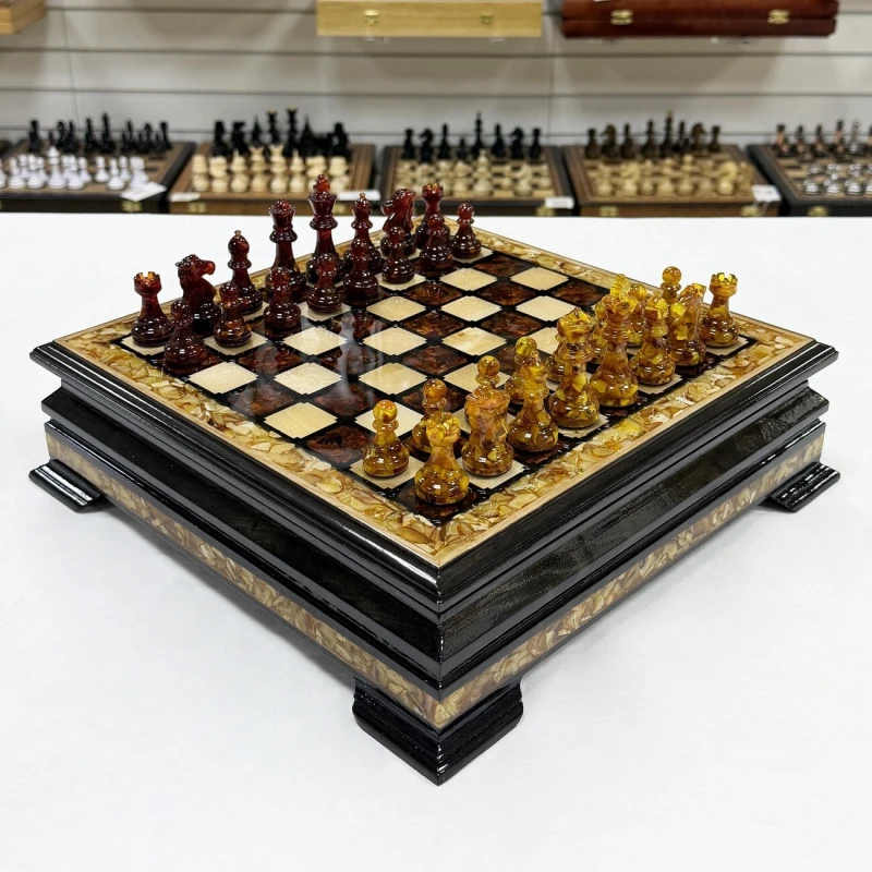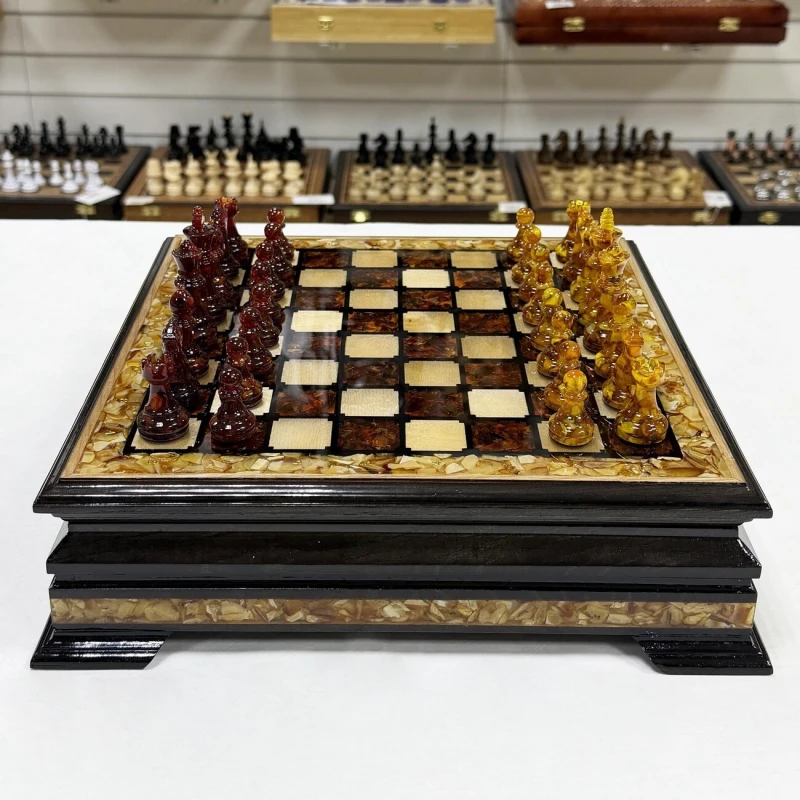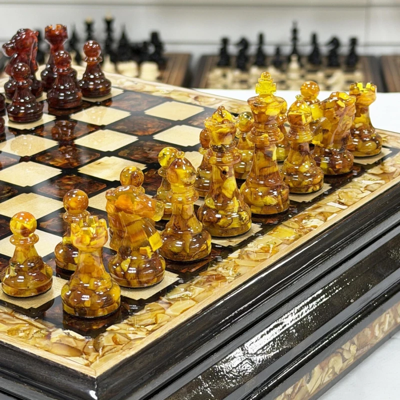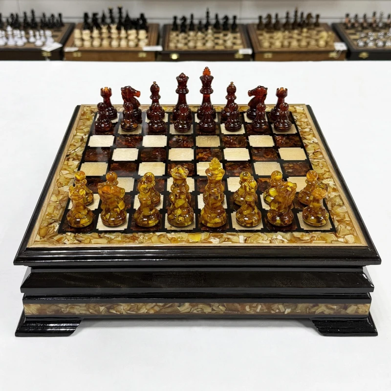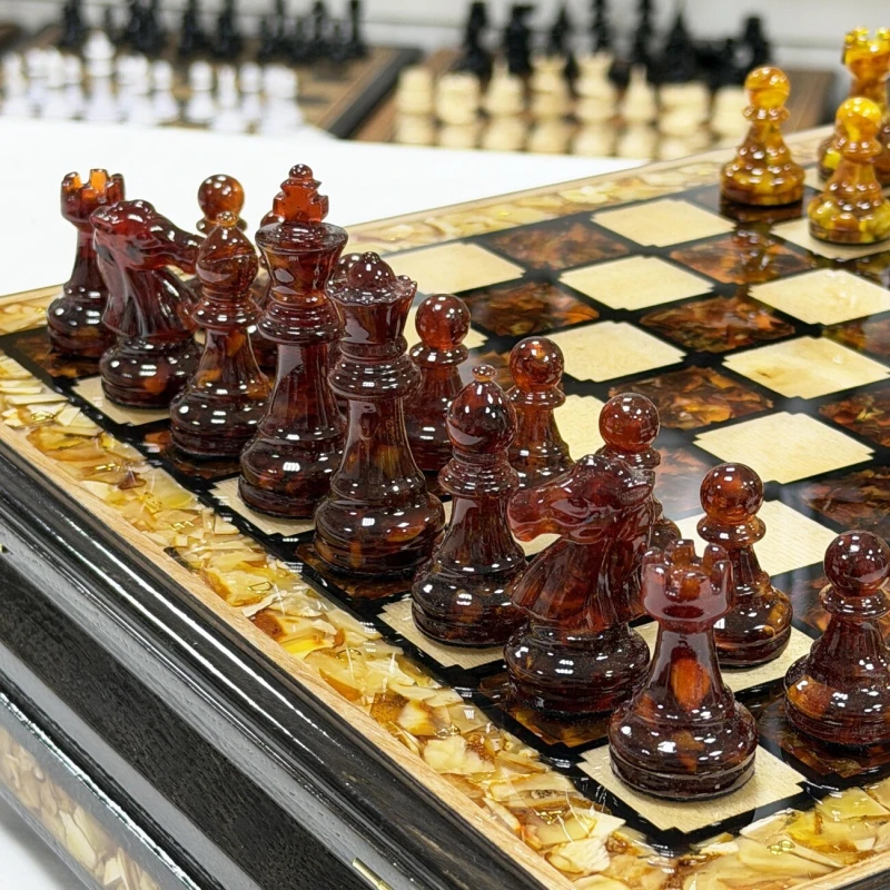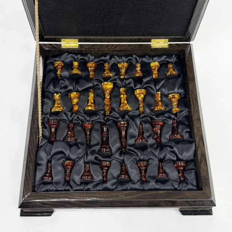 Этот изысканный шахматный ларец выполнен из ясеня и украшен вставками из янтаря, создавая уникальное сочетание природной красоты и мастерства. Размер поля - 34 см он идеально подходит для хранения и игры, а его размеры позволяют наслаждаться каждой фигурой и деталями. В комплект входят фигуры из янтаря и эпоксидной смолы, каждый из которых выполнен с высокой точностью и особым вниманием к деталям, что подчеркивает их природную красоту и насыщенность оттенков. Размер короля - 8 см, пешки - 4 см. Этот шахматный набор станет не только функциональным предметом для игры, но и элегантным украшением интерьера, подчеркивающим вкус и статус владельца.