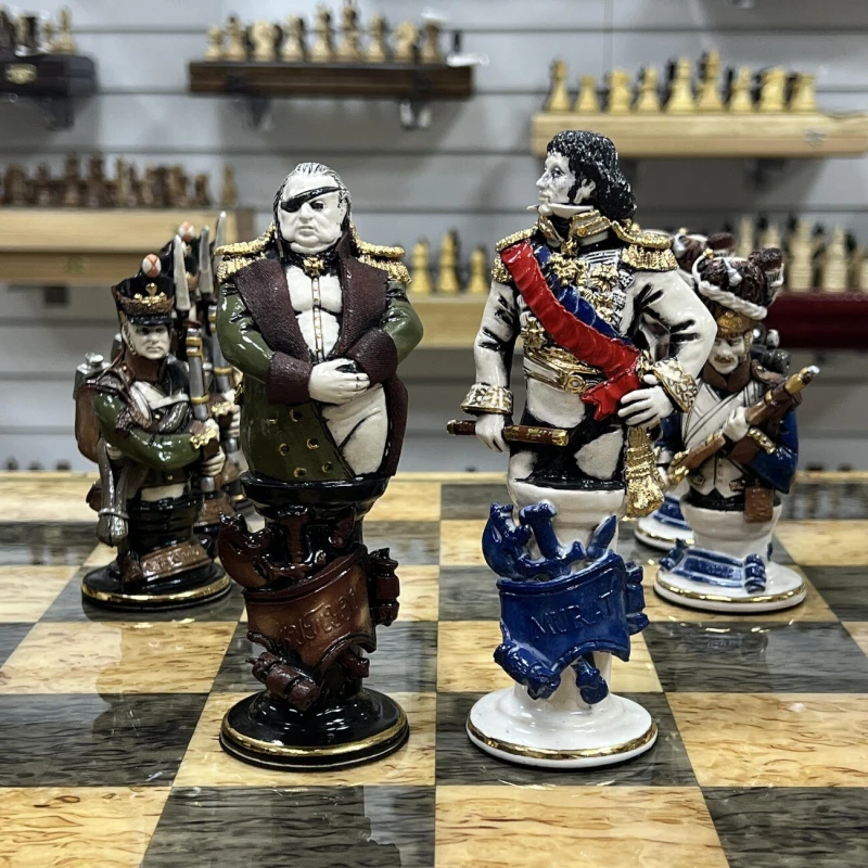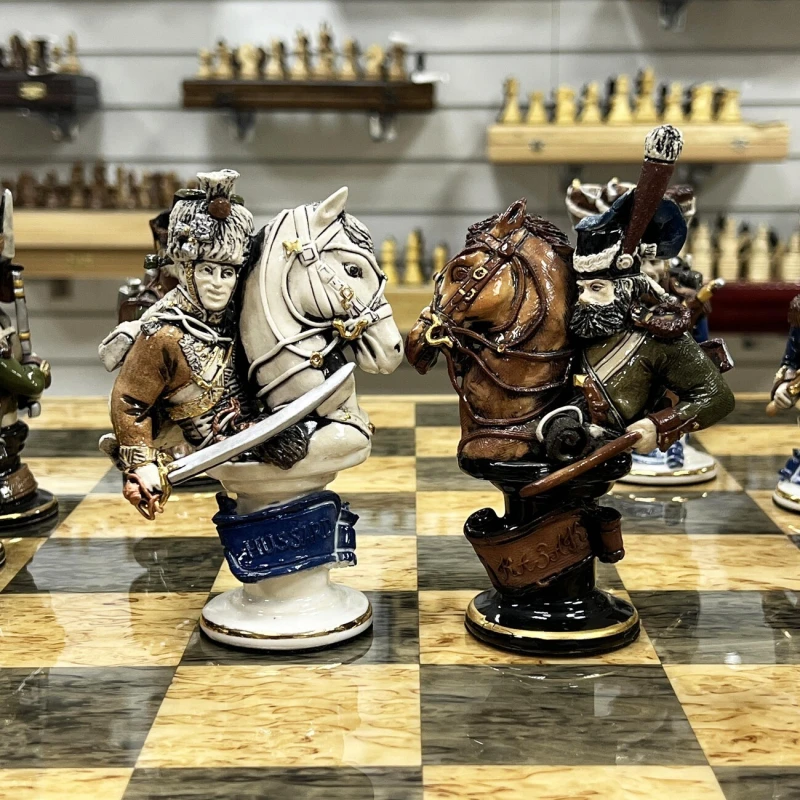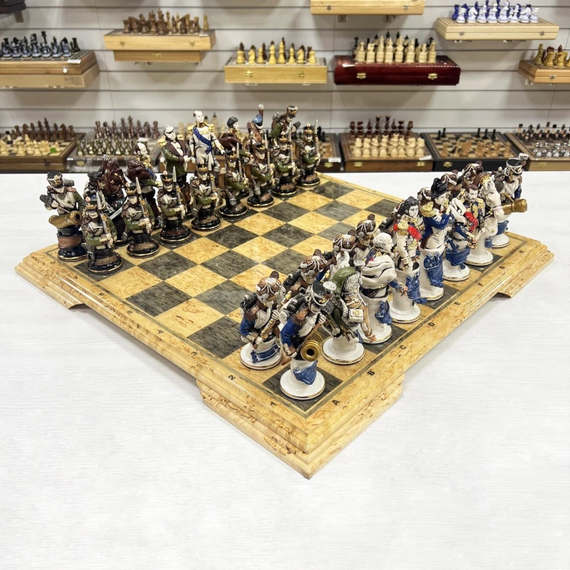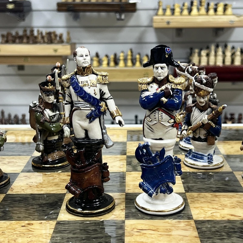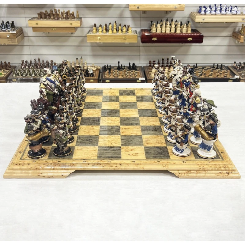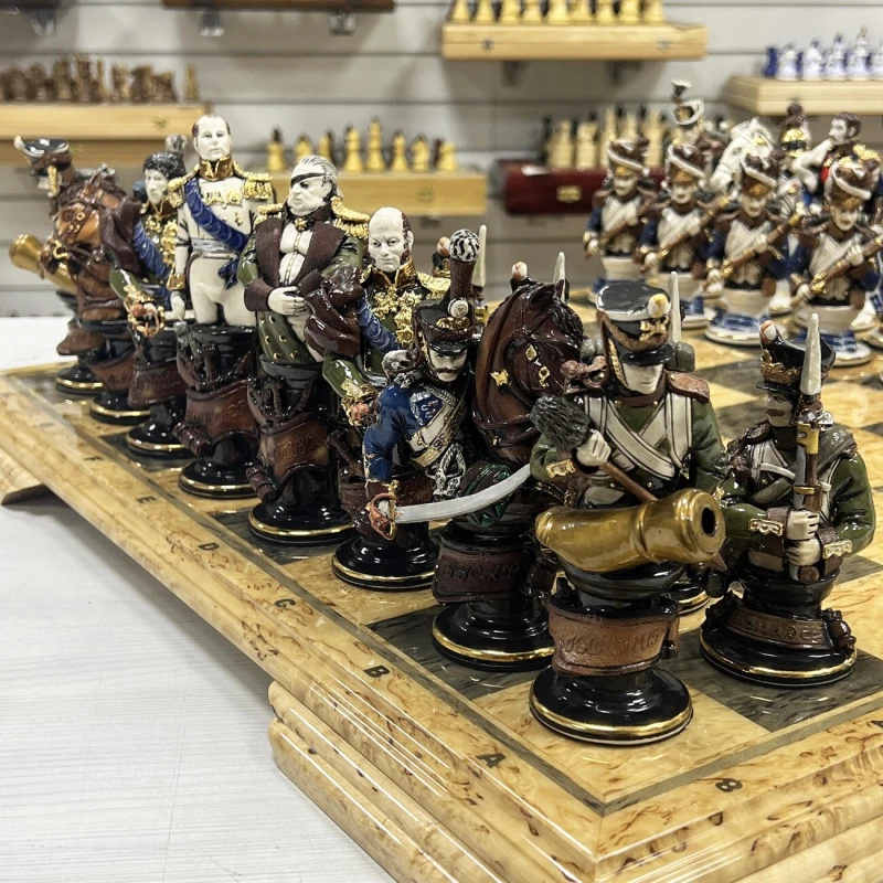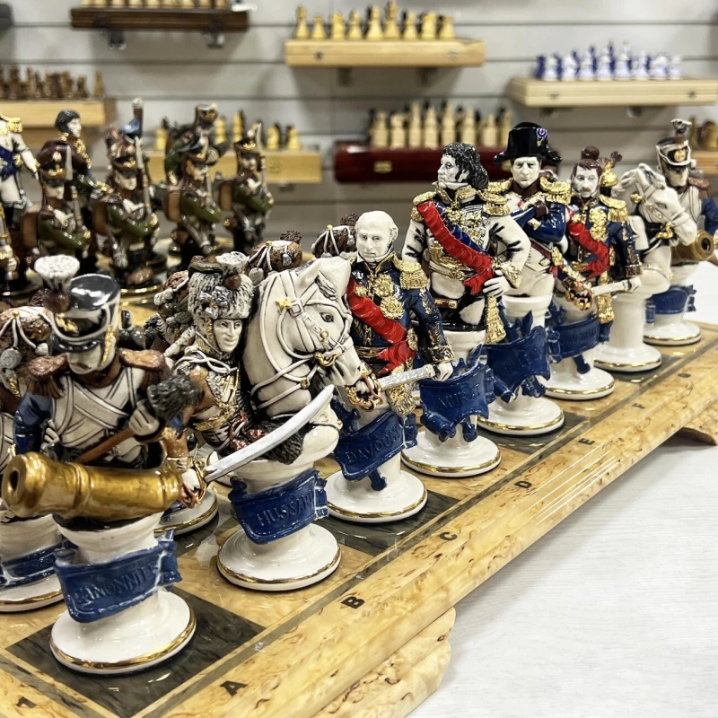 Эксклюзивные шахматы из фарфора, ручная работа от скульптора. Каждая фигурка в виде реального персонажа ( Александр I, Наполеон, Кутузов и другие) с детальной и достоверной прорисовкой черт лица, оружия и мундира. Все фигуры выполнены вручную из фарфора и раскрашены с использованием глазури и золочения. Всего было выпущено 15 комплектов фигур. Вес фигур 5 кг.