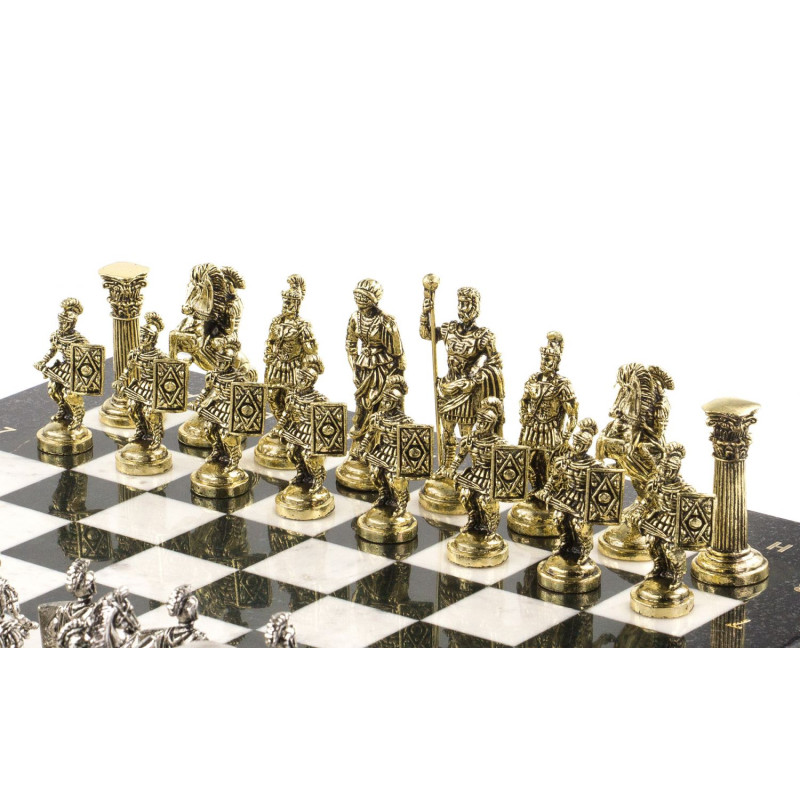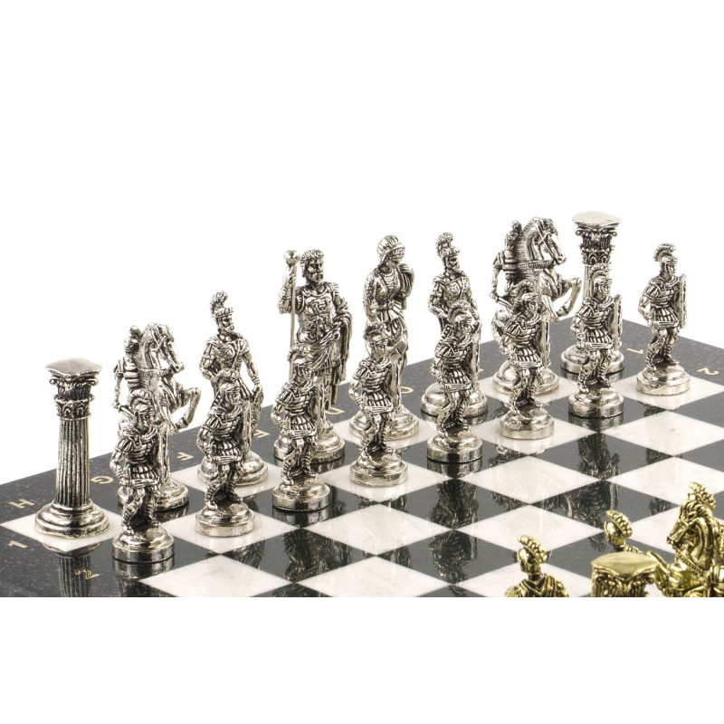 Шахматы изготовлены вручную из белого мрамора и черного змеевика, фигуры из металла с покрытием под золото и серебро, имеют размеры доски 44х44х3 см и весят 14500 г. Подарочные шахматы из камня с красивыми фигурами станут оригинальным подарком на день рождения начальнику, шахматисту или просто любителю игры. В наборе кейс из экокожи.