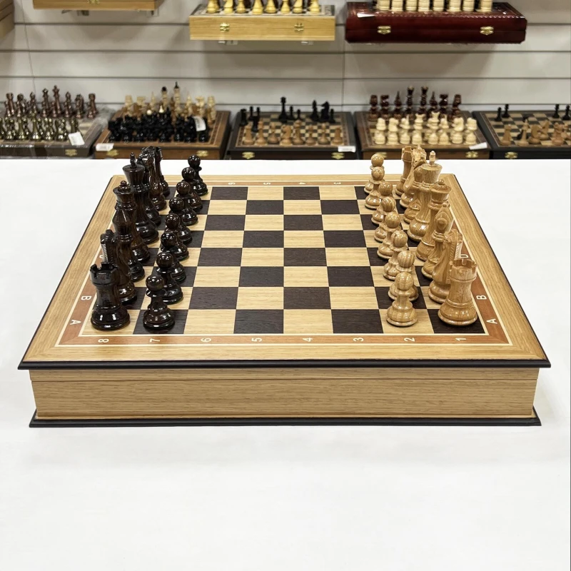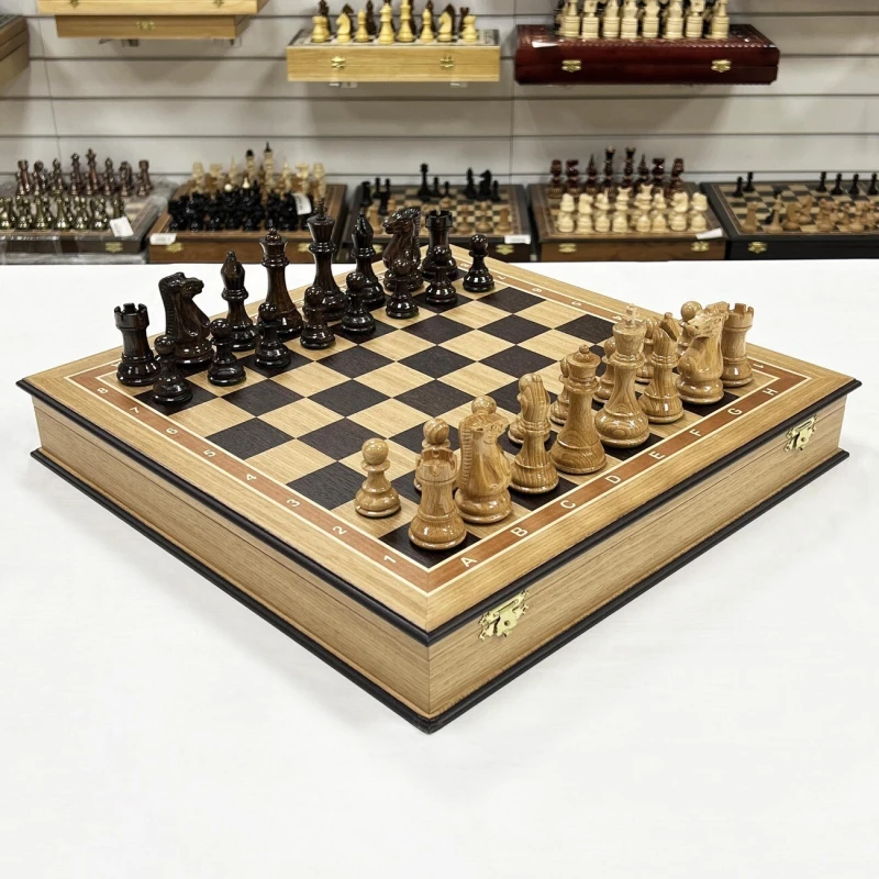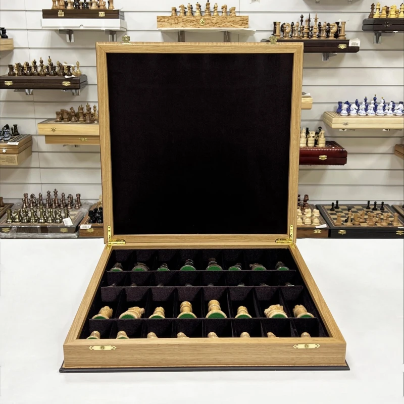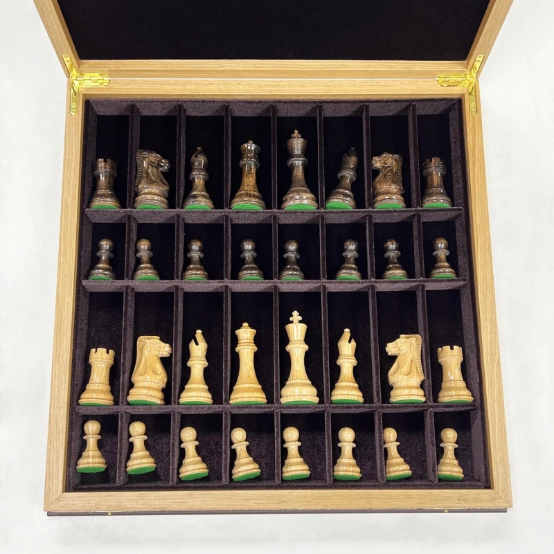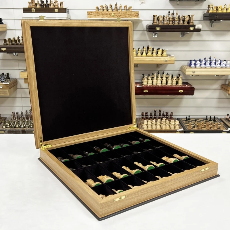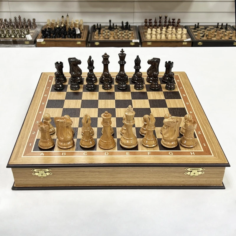 В комплекте фигуры в стиле "Стаунтон" из дуба с утяжелением, отлично сочетаются с доской. Внутри ларца имеются ячейки для фигур, оббитые бархатом. Высота Короля - 10 см Высота пешки - 5 см. Материал доски - дуб, фигур - дуб и ясень. Диаметр основания короля - 5 см Диаметр основания пешки - 2.5 см.