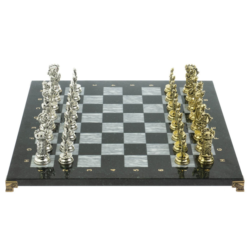 Шахматы "Средневековые рыцари" доска серый мрамор 44х44 см размером доска 44х44х3 см, клетка 4,5х4,5 см, высота фигур: пешка 8 см, король 10 см. и весом 14500 г. Шахматы металлические имеют классический дизайн и вдобавок они сделаны вручную из натуральных и экологичных материалов.