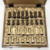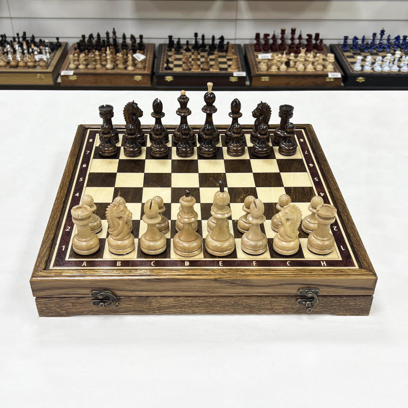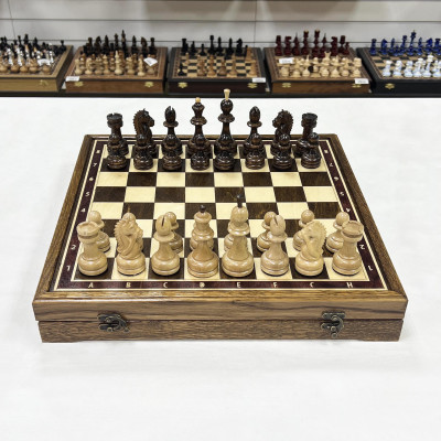 Размер доски 40 на 40 см, внутри доски есть ячейки для фигур. Материал доски дуб, материал фигур Кавказский граб. Высота короля 10 см, высота пешки 5 см. Шахматные фигуры с утяжелением. Подойдут в подарок для детей и взрослых.