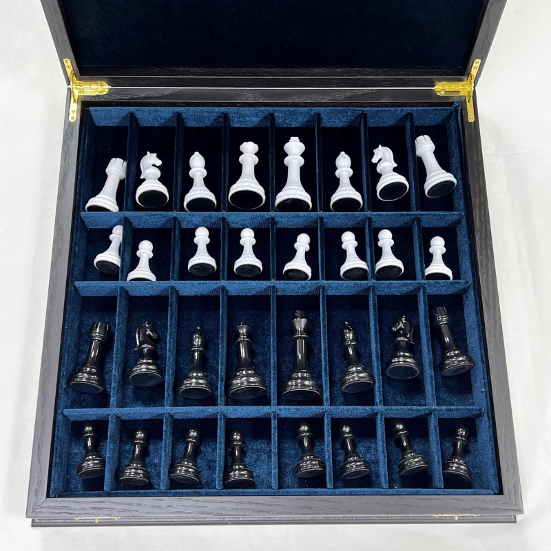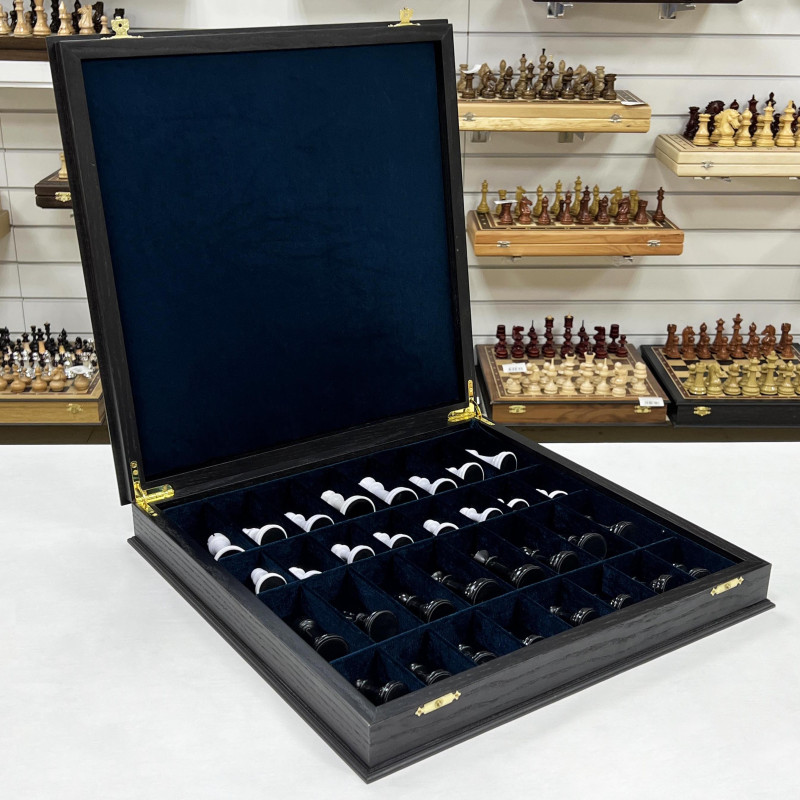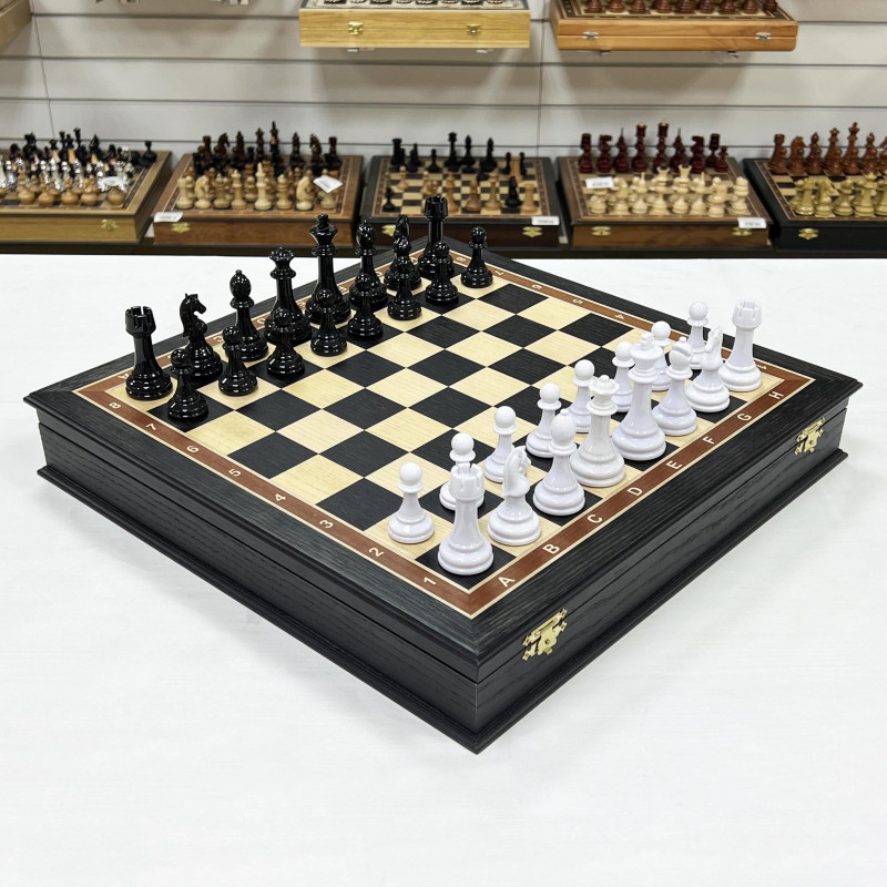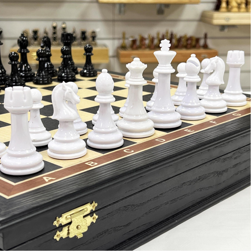 Подарочные шахматы из моренного дуба, ясеня с утяжеленными фигурами в необычном стиле из композита. Форма фигур Стаунтон. Размер доски 45 на 45 см, размер клетки 4.5 см. Материал светлой клетки ясень, темной клетки моренный дуб.