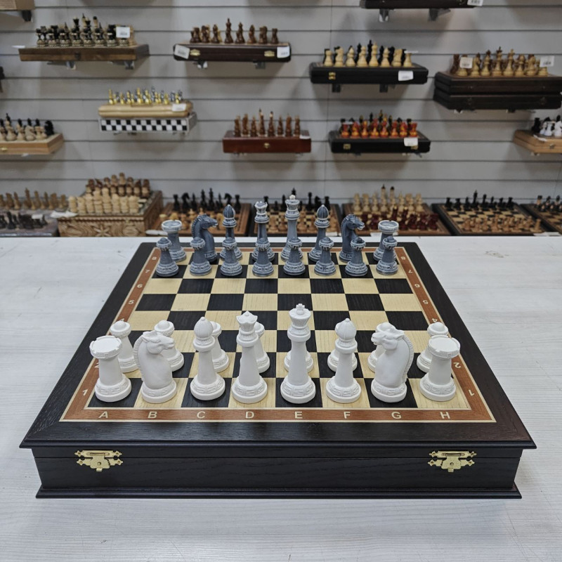 Шахматы ручной работы подарочные в ларце из мореного дуба, размером 45х45см. Размер клетки -4.5 см. Фигуры выполнены из литьевого мрамора, изготавливаются на Урале. Размер фигур король - 9.1см пешка - 5.5см. Внутри ларца располагаются ячейки обшитые бархатом для удобного и безопасного хранения фигур.