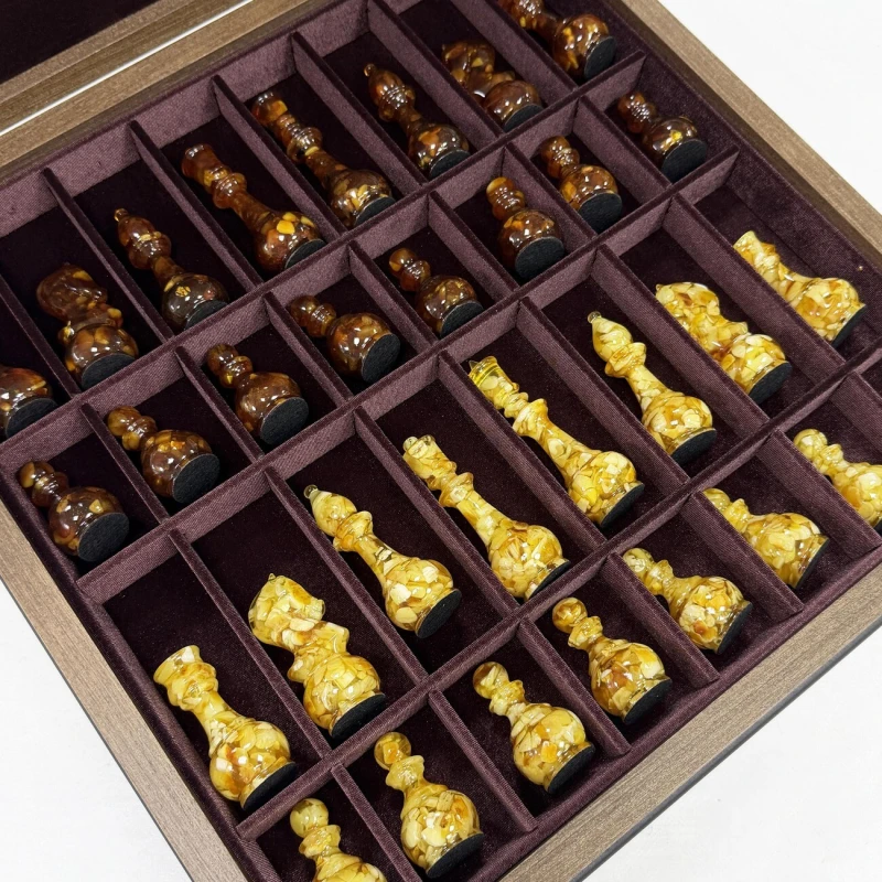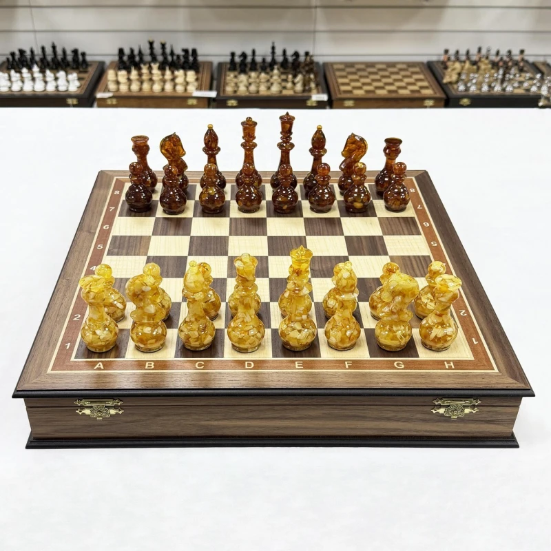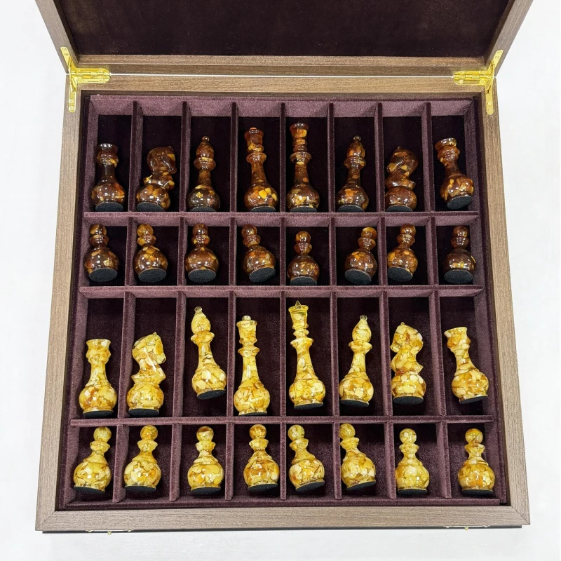Великолепный набор шахмат из янтаря в нашем магазине. Размер доски 45 на 45 см. Ларец собирается вручную из шпона ценных пород дерева. темная клетка - орех, светлая - ясень. Размер клетки 4,5 см. Самый оптимальный размер. Изящные фигуры из янтаря и эпоксидной смолы дополняют ларец. Высота короля 11 см, высота пешки 6 см. Шахматные фигуры с утяжелением и с подклейкой. Сделаны в России. Подарочные шахматы подойдут для детей и взрослых.