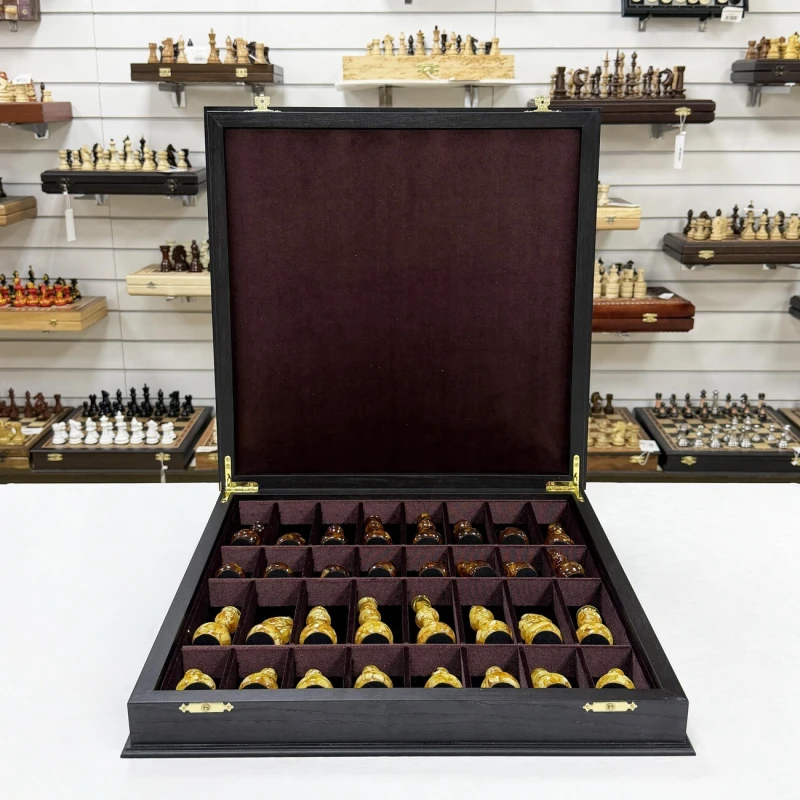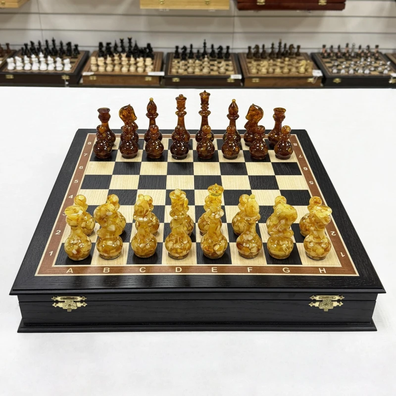 Шахматы янтарные в ларце из дерева мореного дуба