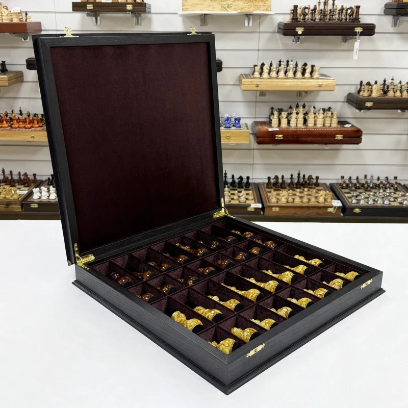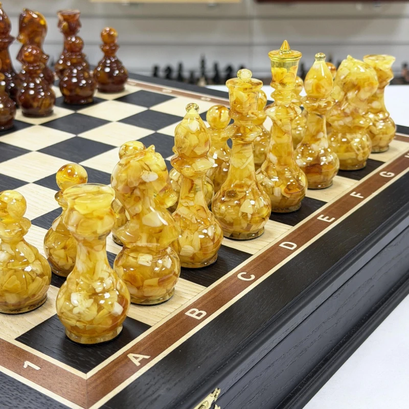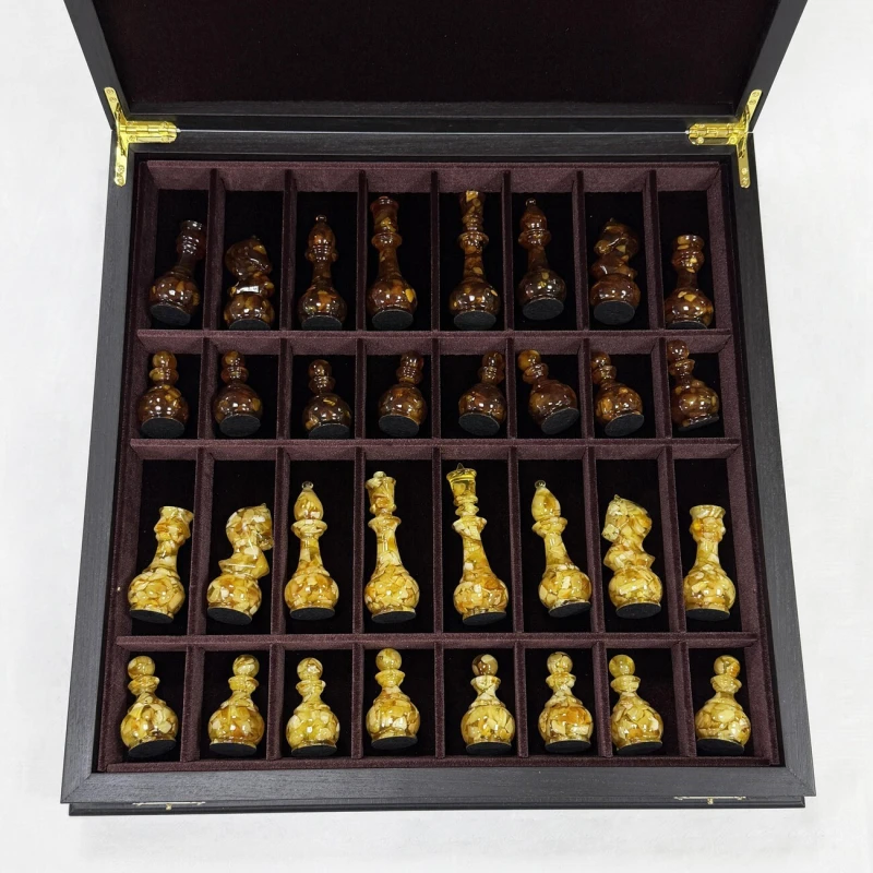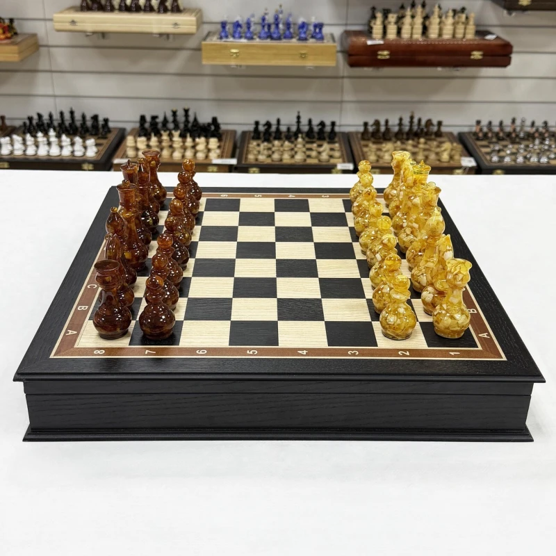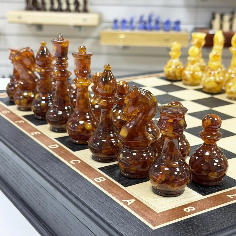 Великолепный набор шахмат из янтаря в нашем магазине. Размер доски 45 на 45 см. Ларец собирается вручную из шпона ценных пород дерева. темная клетка - моренный дуб, светлая - ясень. Размер клетки 4,5 см. Самый оптимальный размер. Изящные фигуры из янтаря и эпоксидной смолы дополняют ларец. Высота короля 11 см, высота пешки 6 см. Шахматные фигуры с утяжелением и с подклейкой. Сделаны в России. Подарочные шахматы подойдут для детей и взрослых.