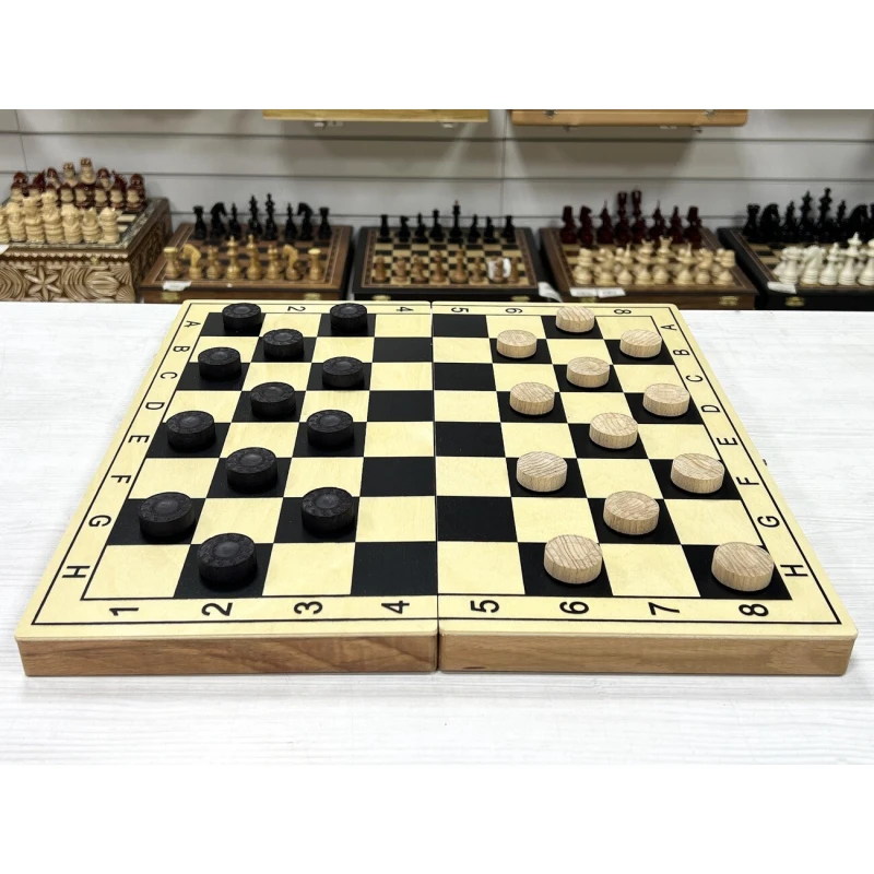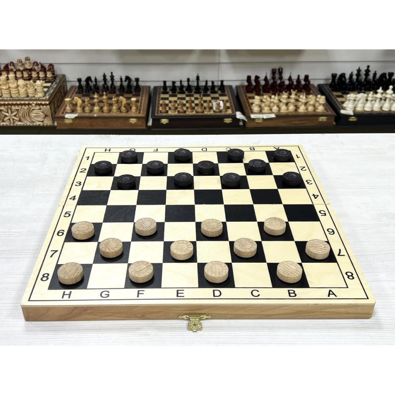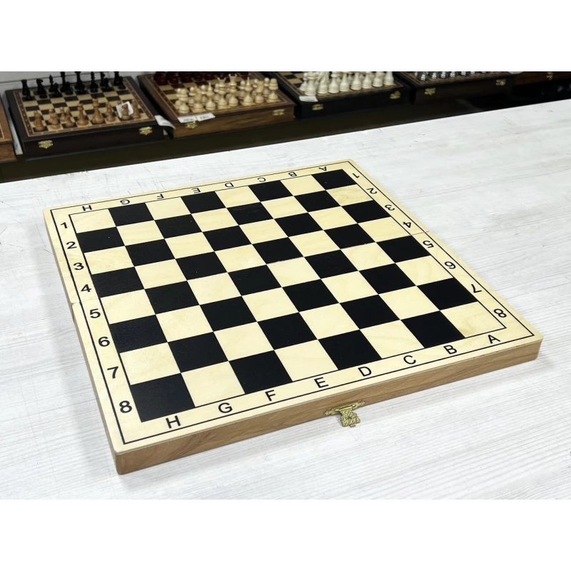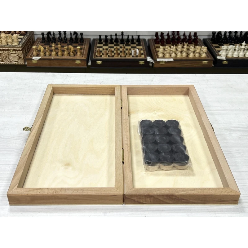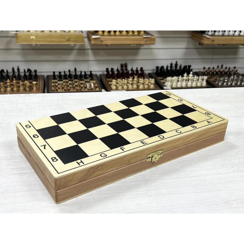 Классические шахматы из дерева. Доска бук, шашки бук. Шашки с подклейкой. Размер шашки 3 см. Размер доски 42 на 42 см. Доска закрывается на замочек.