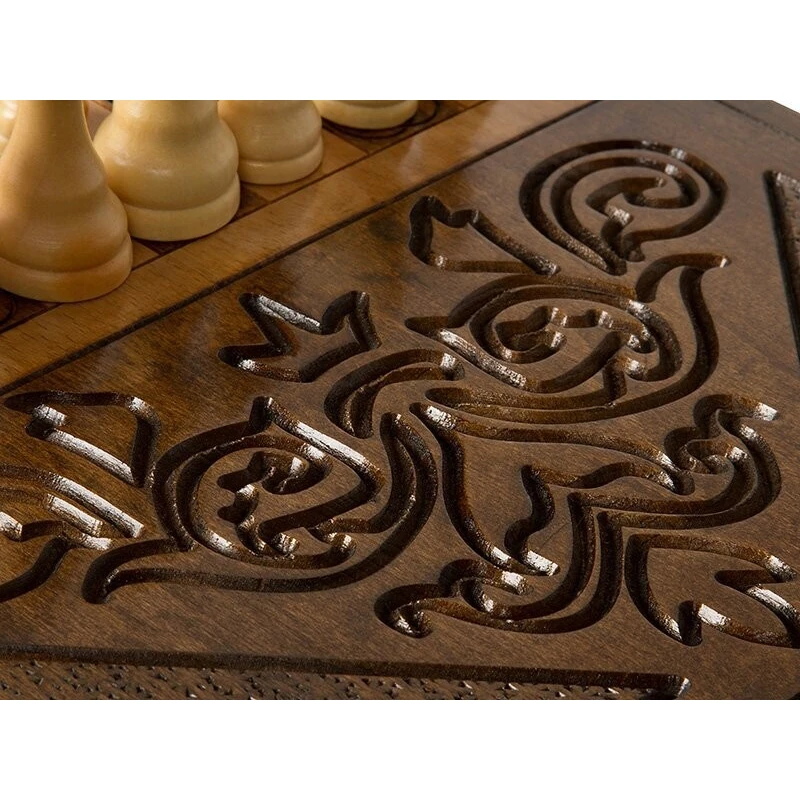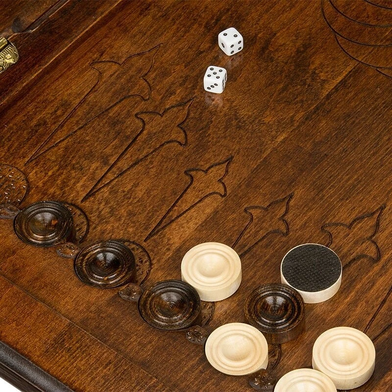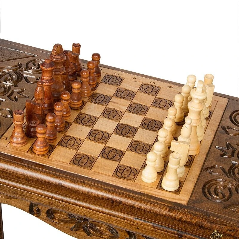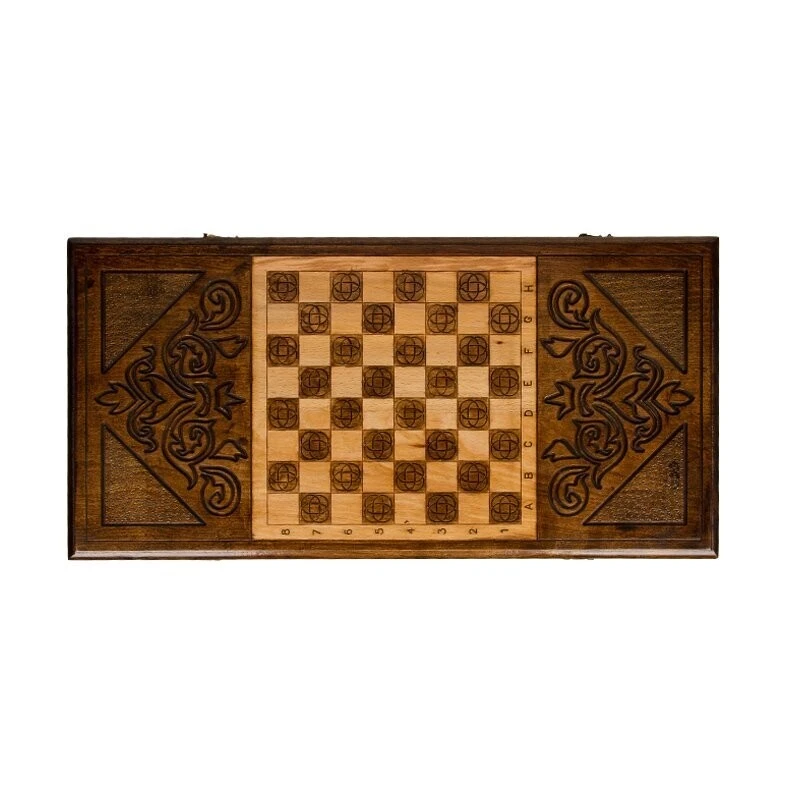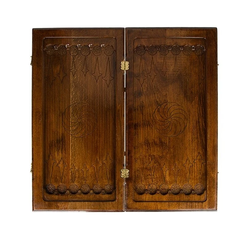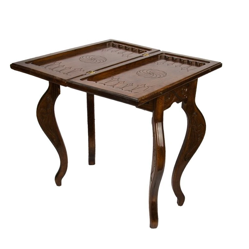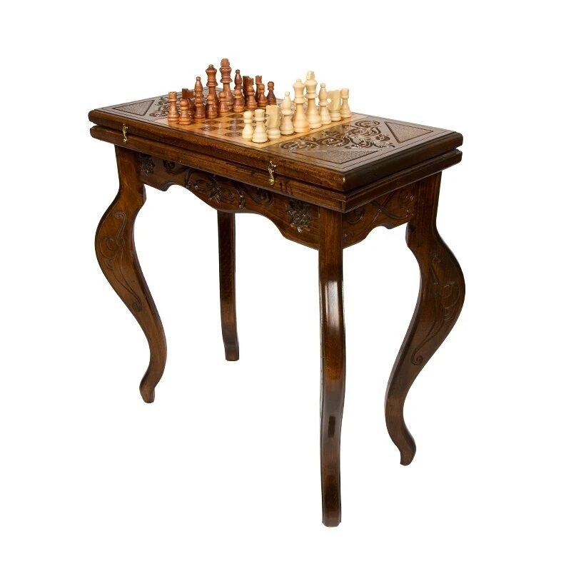 Когда смотришь на данное изделие, даже не сразу понимаешь, что это игровая поверхность – настолько он изумительно выглядит. Мастер Григорий Устян, сумел сделать его так хорошо, что даже если захотеть – не удается найти каких-либо минусов. Тут все идеально, начиная с материалов изготовления и заканчивая изысканным украшением. Бережное обращение – залог долговечности Для создания Стол ломберный Нарды и Шахматы мастер отдал предпочтение проверенной древесине бука. Она позволяет гарантировать, что покупка будет сделана единожды и на очень долгий промежуток времени. Конечно, нужно за ней периодически ухаживать и относиться бережно, не допуская ударов и падения, проливания жидкостей и других случайностей. Хотя, древесина обладает неплохой прочностью, которая позволит выдерживать некоторые механические воздействия. Бронзовые петли надежно удерживают створки между собой и обеспечивают хорошую устойчивость в открытом виде. Как в доме у аристократа Ножки выполнены в фигурной форме, аналогично той, которая использовалась в XVIII веке для изготовления мебели аристократов. Да и весь стол выглядит аналогично - аскетично, в стиле ретро. В закрытом виде, на лицевой створке встречает шахматное поле, окруженное красивой резьбой. Открыв створку, вы получите поверхность для нард, где каждая ячейка оформляется резьбой, а в центре расположился радиальный узор. Из-за его внешнего вида, вам не нужно будет прятать, а скорее, наоборот – поставите в центре комнаты, чтобы все, кто приходит в гости, сразу же видели. Он способен вписаться практически в любой интерьер и выступать в качестве ее украшения. Комплект тут полный – фишки, кости и шахматные фигурки. Это позволяет приступить к игре сразу же, как только стол «приезжает» домой и встает на законное место.