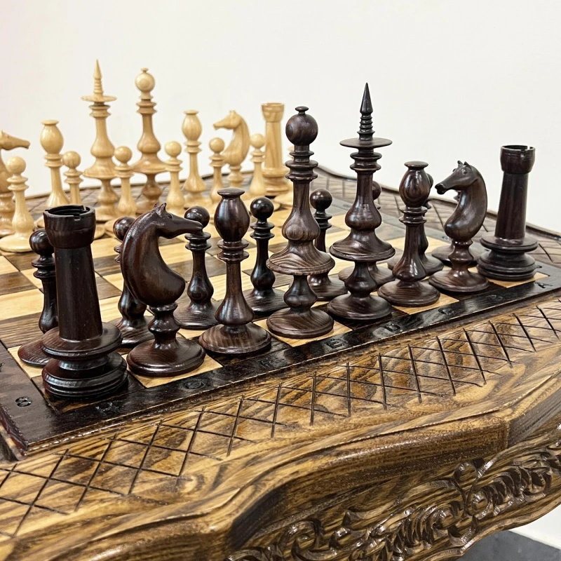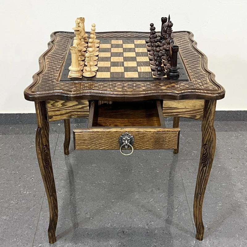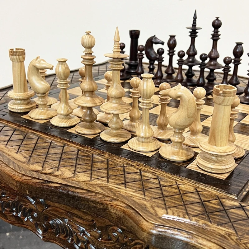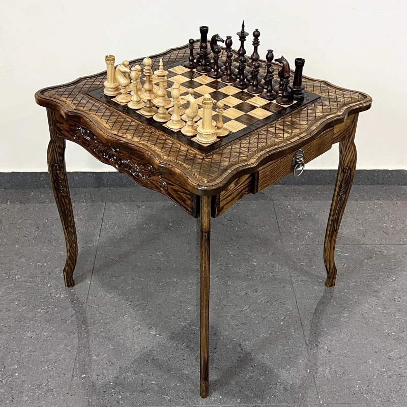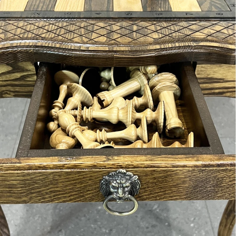 Деревянный шахматный набор ручной работы из ясеня. Размер стола: высота стола 60 см. Размер доски 58 на 58 см. Размер шахматного поля 40 на 40 см. По бокам находится 2 выдвижных ящика для хранения фигур. В комплекте идут эксклюзивные шахматные фигуры из массива ясеня. Высота короля 14 см, высота пешки 7 см. Фигуры достаточно изящные с хорошей детализацией.